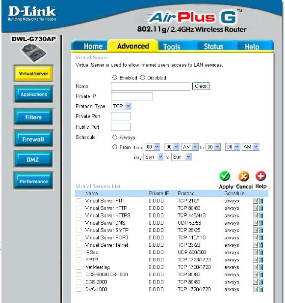 The DWL-G730AP can be configured as a virtual server so that remote users accessing