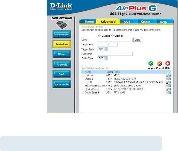 The DWL-G730AP provides some predefined applications in the table on the bottom of