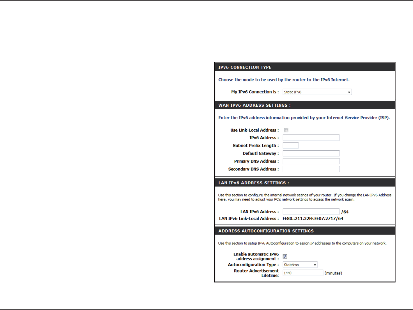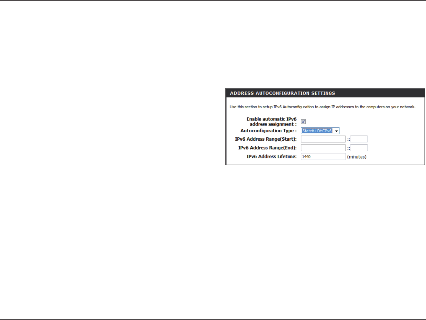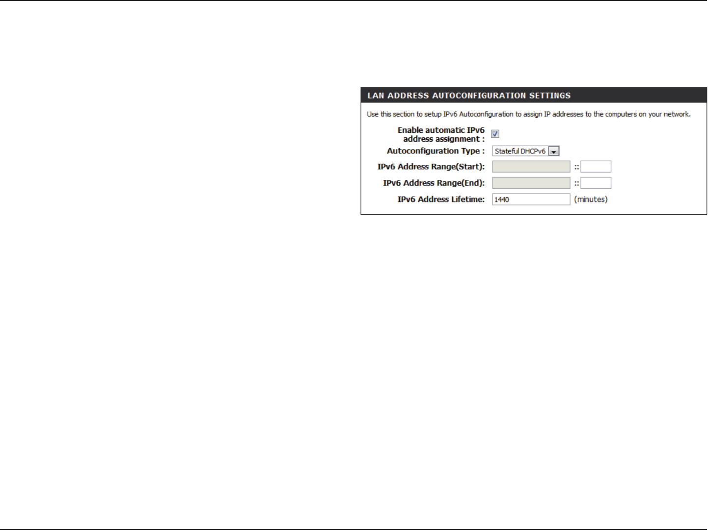 To congure the Router to use a Static IPv6 Stateful connection, congure the parameters in the LAN Address Autoconguration