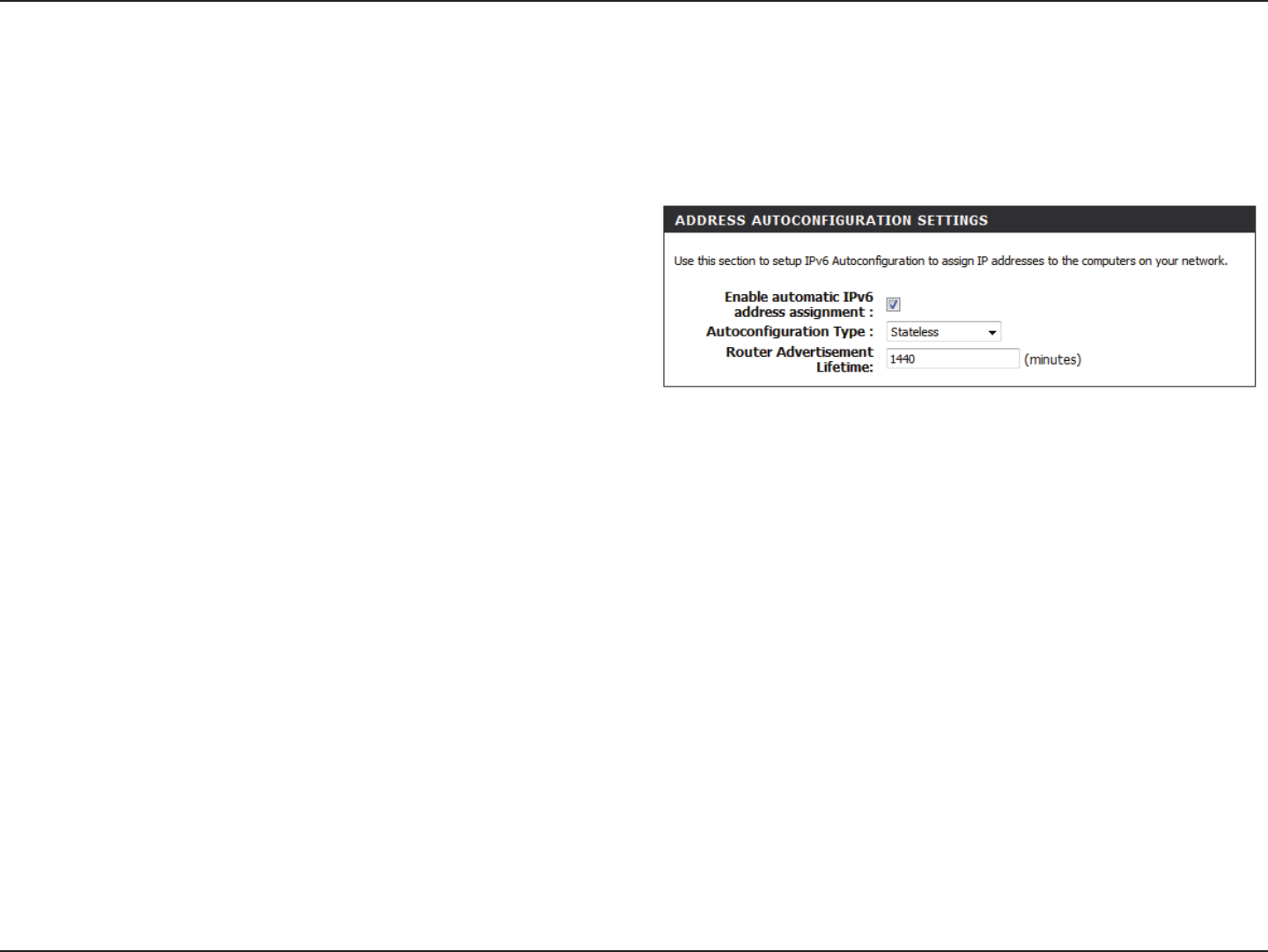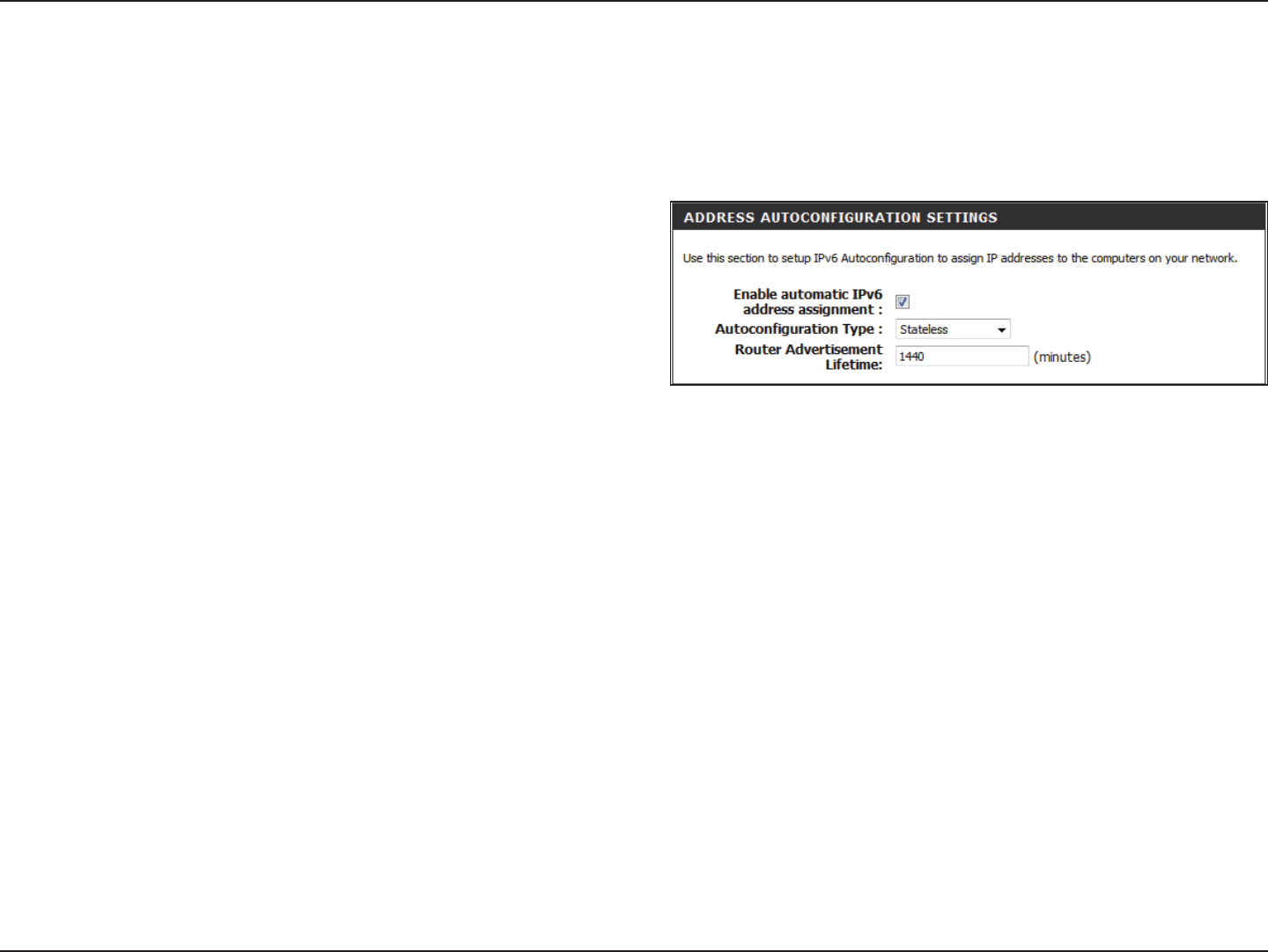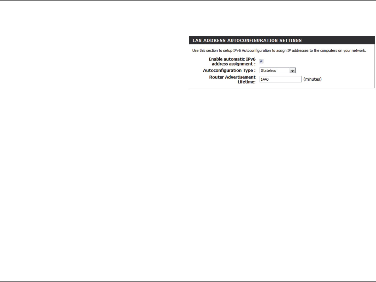 To congure the Router to use a Static IPv6 Stateless connection, congure the parameters in the LAN Address Autoconguration