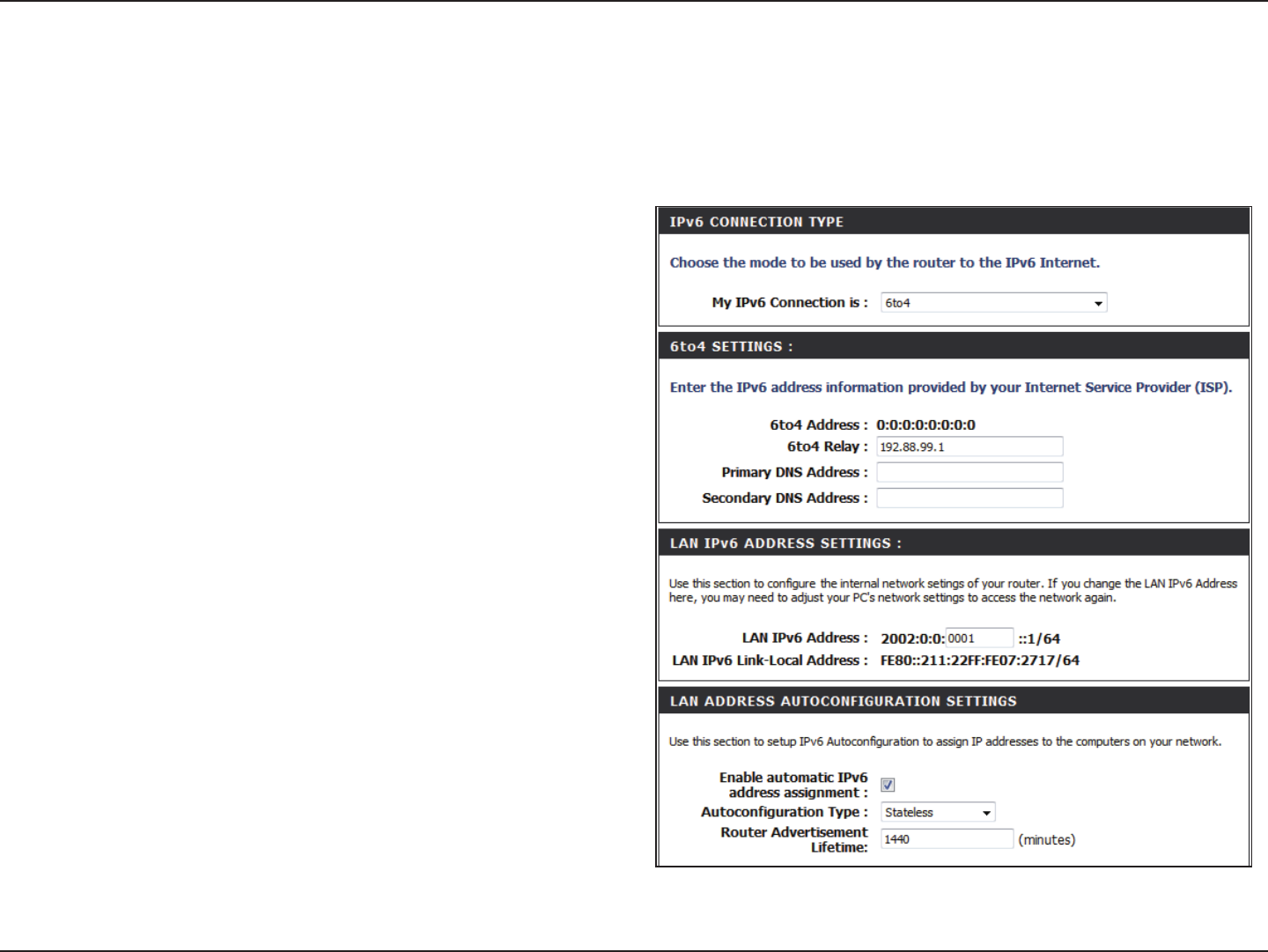 Select 6to4 from the My IPv6 Connection is drop-down menu if your Router will use a 6 to 4 tunnel to connect to the Internet.
