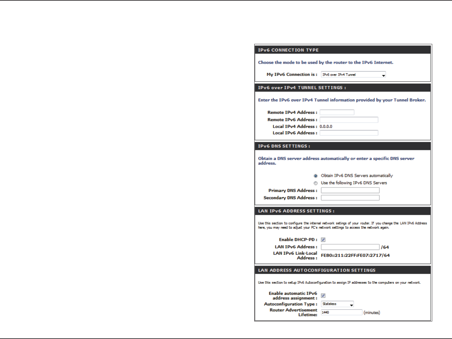 To congure the Router to use an IPv6 to IPv4 tunnel stateless autoconguration connection, congure the parameters in the