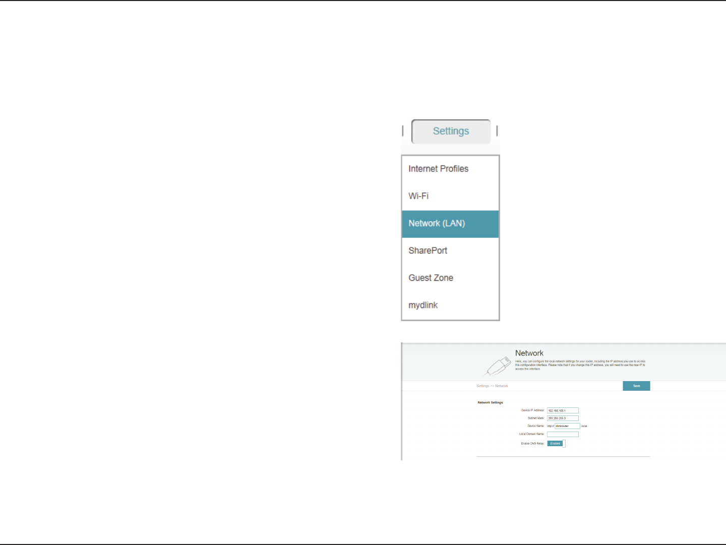 You can congure the local network settings for your router by going to Network (LAN) under Settings. Click Save when you