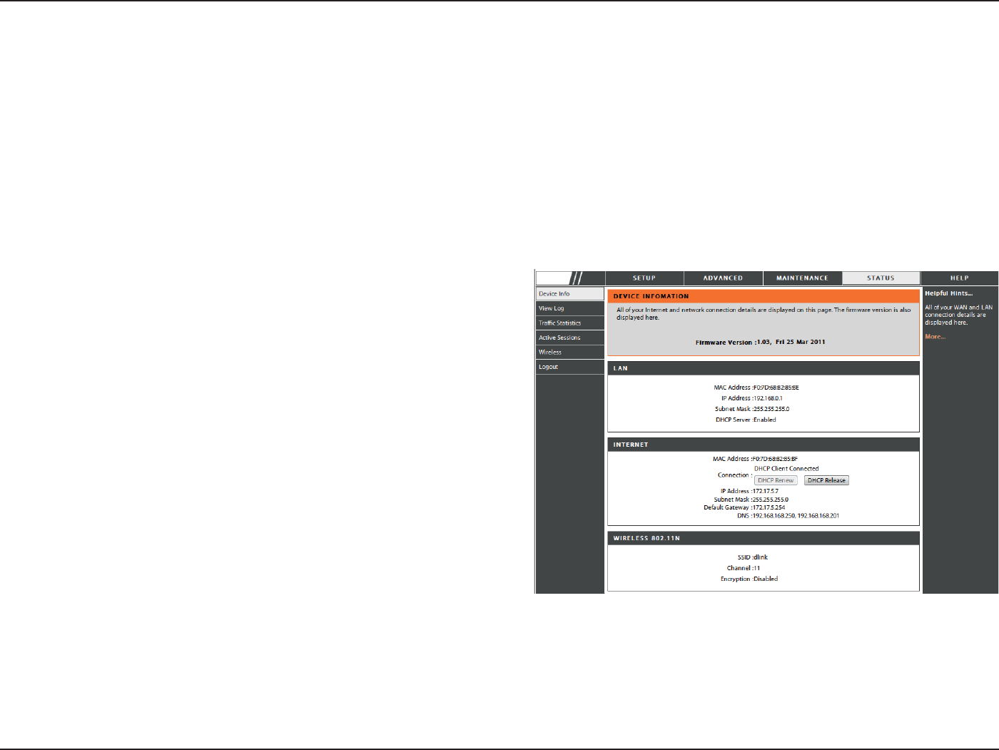This window displays the current information for the DIR-605L. It will display the LAN, WAN, and Wireless information.