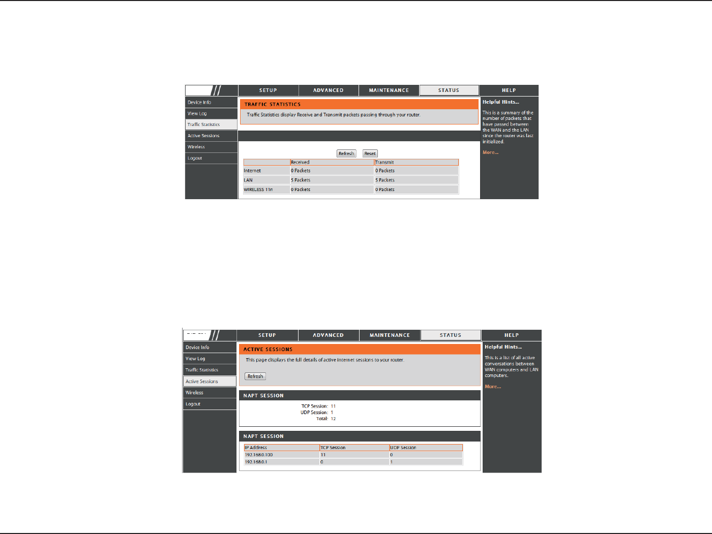 The window below displays the Trac Statistics. Here you can view the amount of packets that pass through the DIR-605L on both