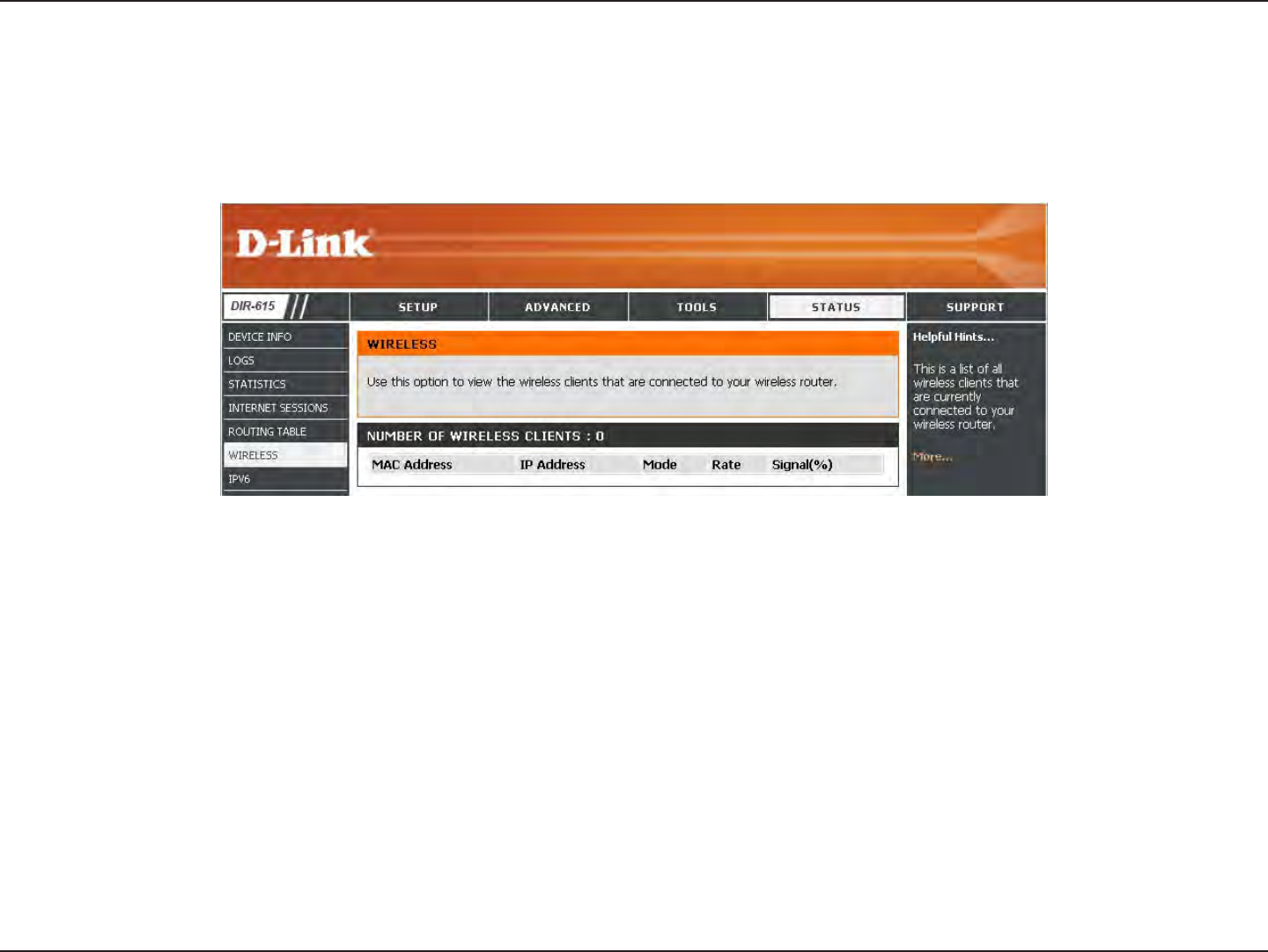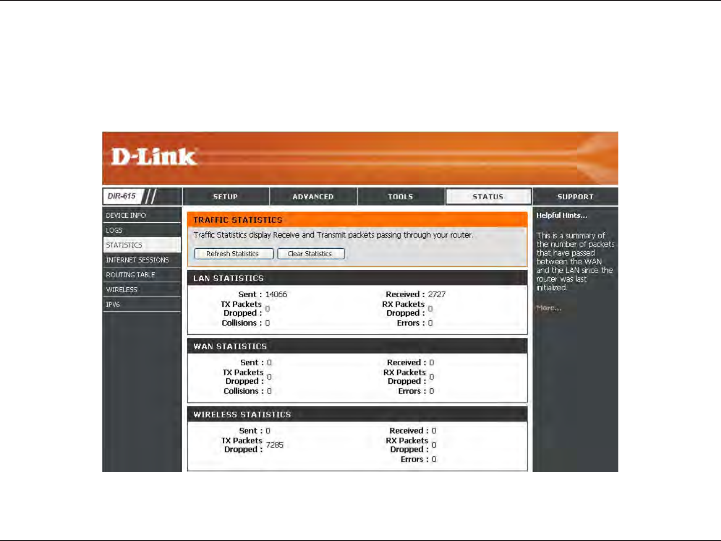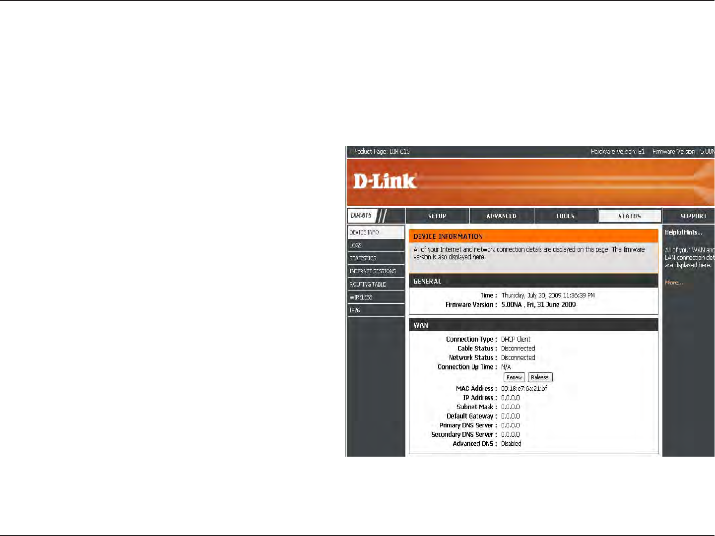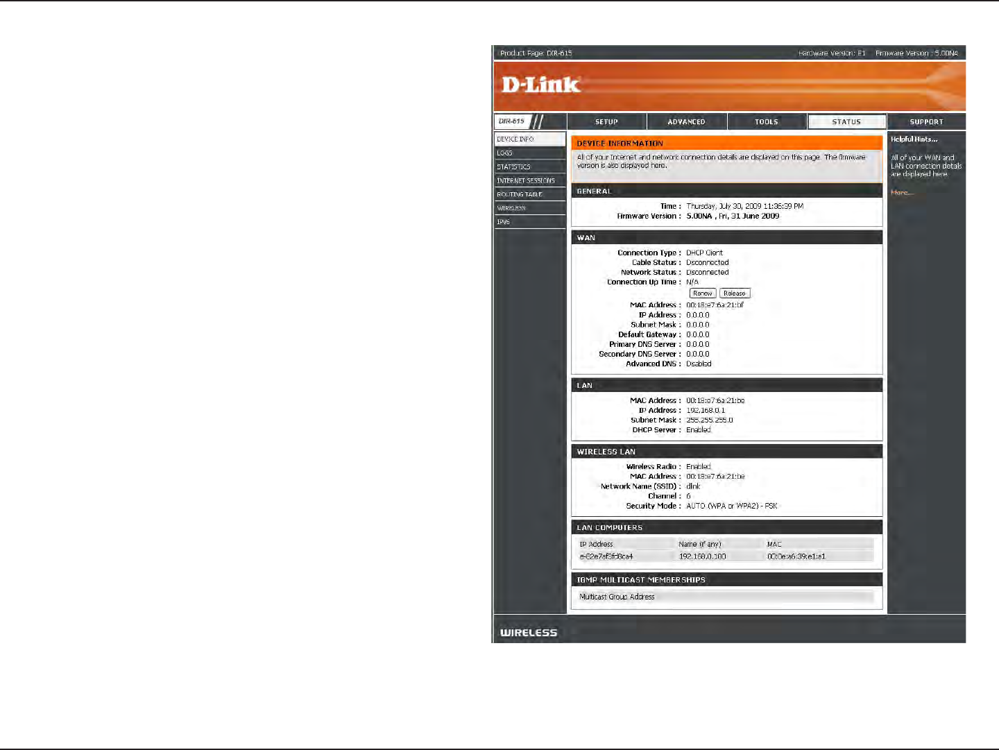 This page displays the current information for the DIR-615. It will display the LAN, WAN (Internet), and Wireless