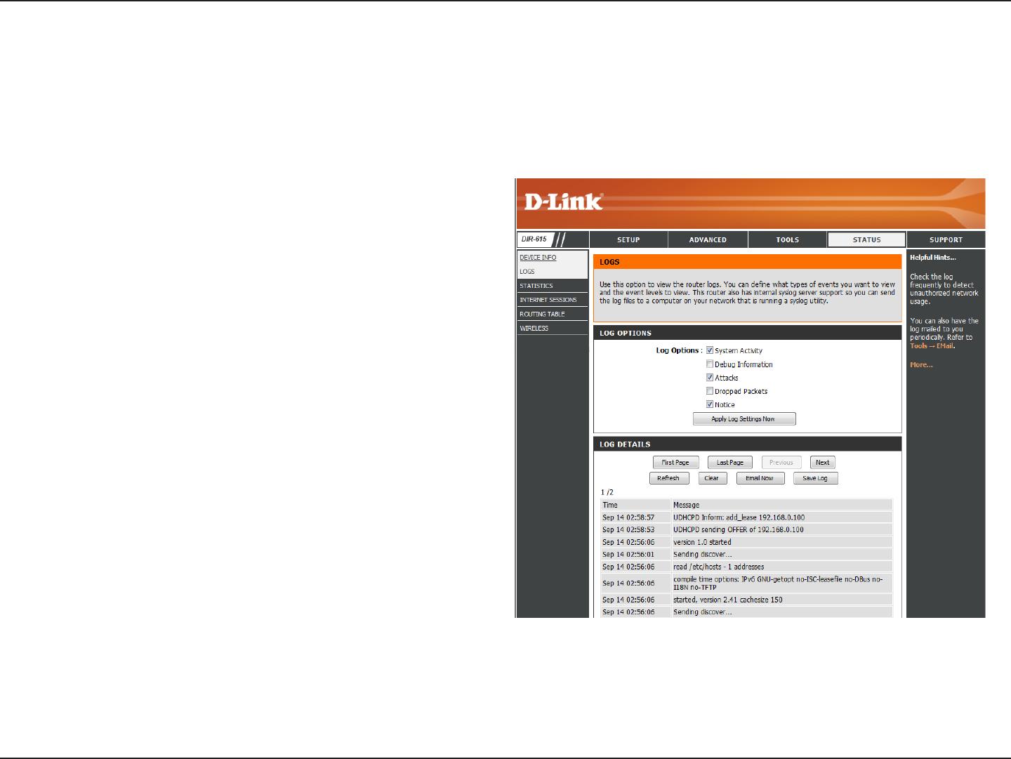 of older events are deleted but logs of the latest events are retained. The Logs option allows you to view the router logs. You can dene what types
