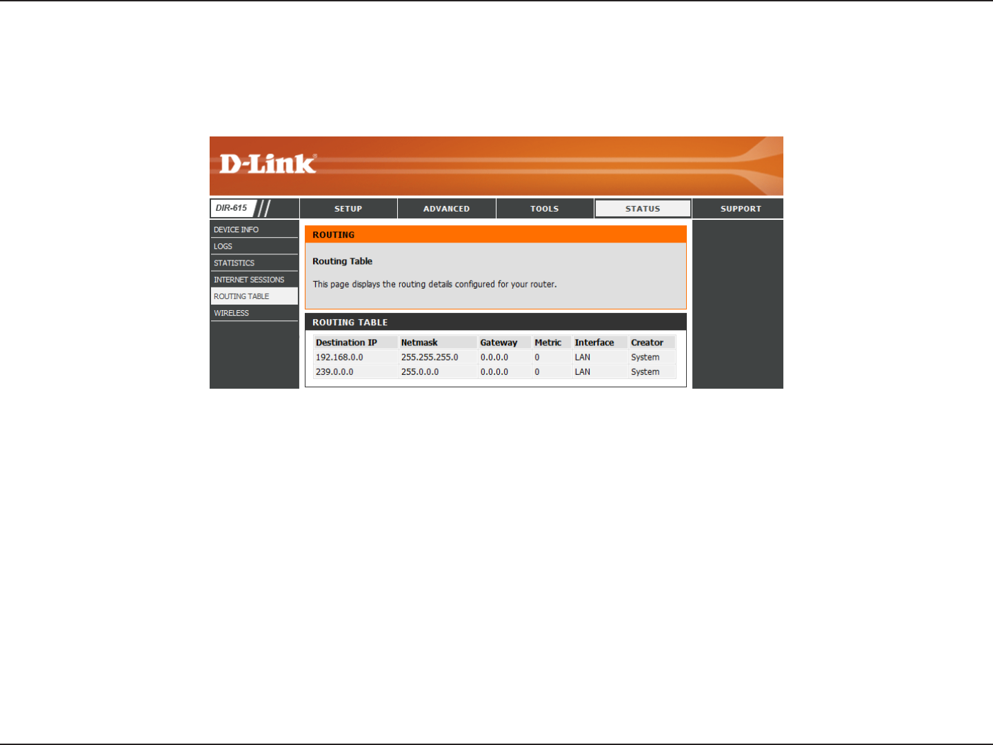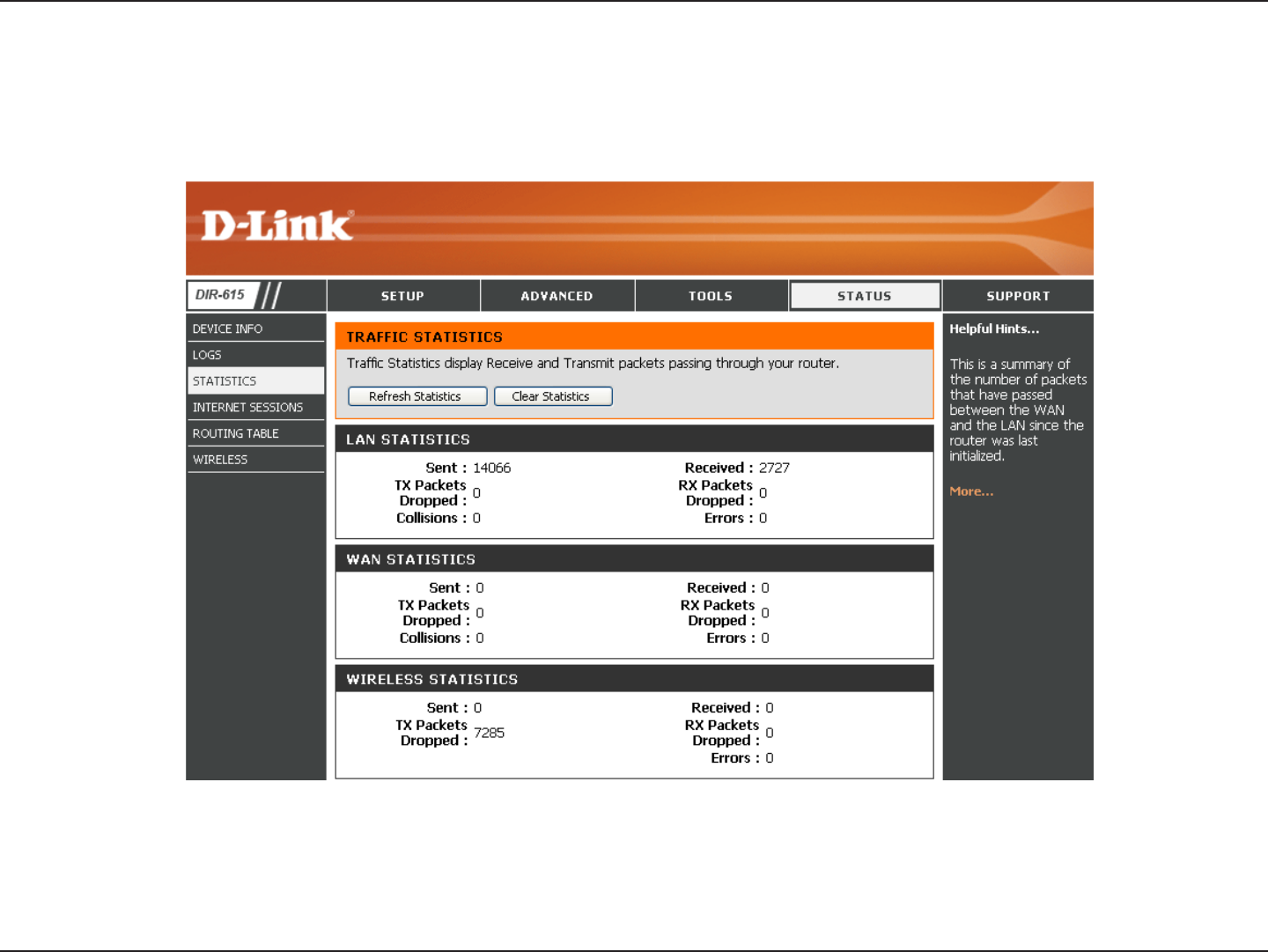 The screen below displays the Trac Statistics. Here you can view the amount of packets that pass through the DIR-615 on both the Internet and the LAN