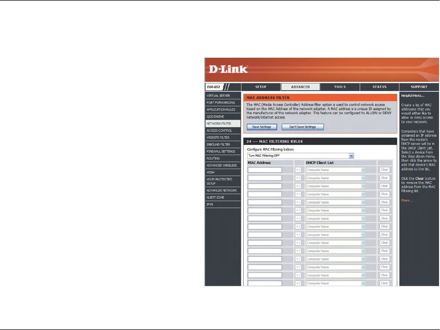 Use MAC (Media Access Control) Filters to allow or deny LAN (Local Area Network) computers by their MAC addresses from accessing the Network. You