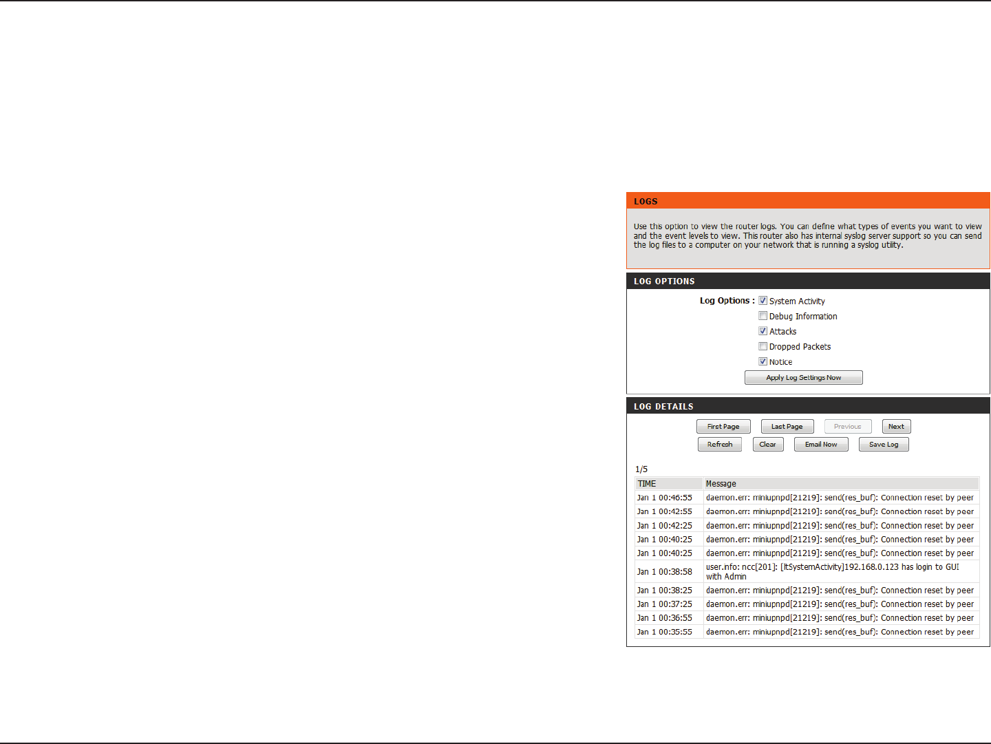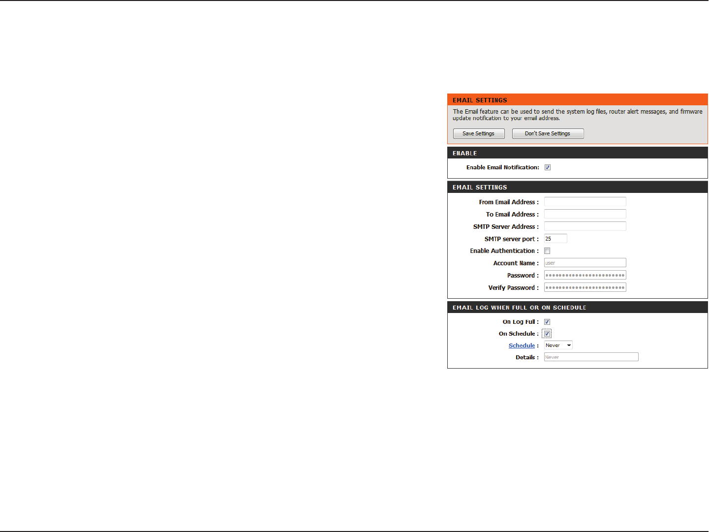 The Email feature can be used to send the system log les, router alert messages, and rmware update notication to your