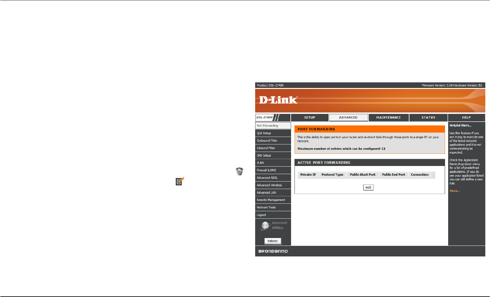 To access the Port Forwarding window, click the Port Forwarding button in the Advanced directory.