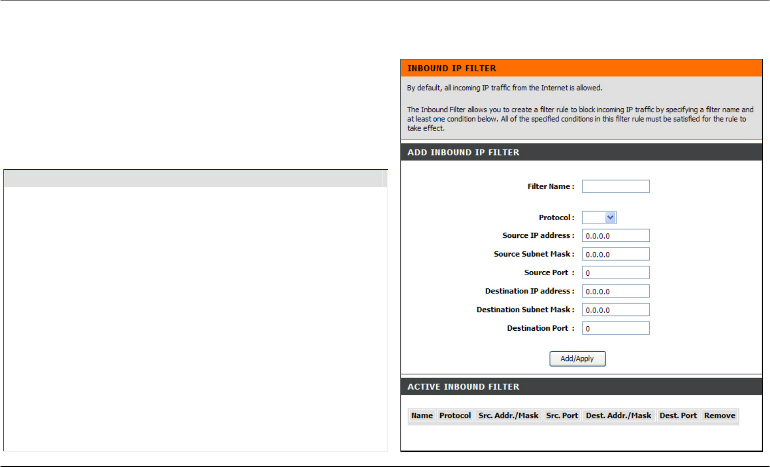 The Inbound Filter allows you to create a filter rule to allow incoming IP