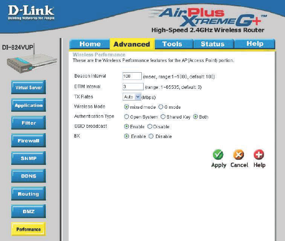 8x Enable 8X Mode on the wireless client and the DI-824VUP to