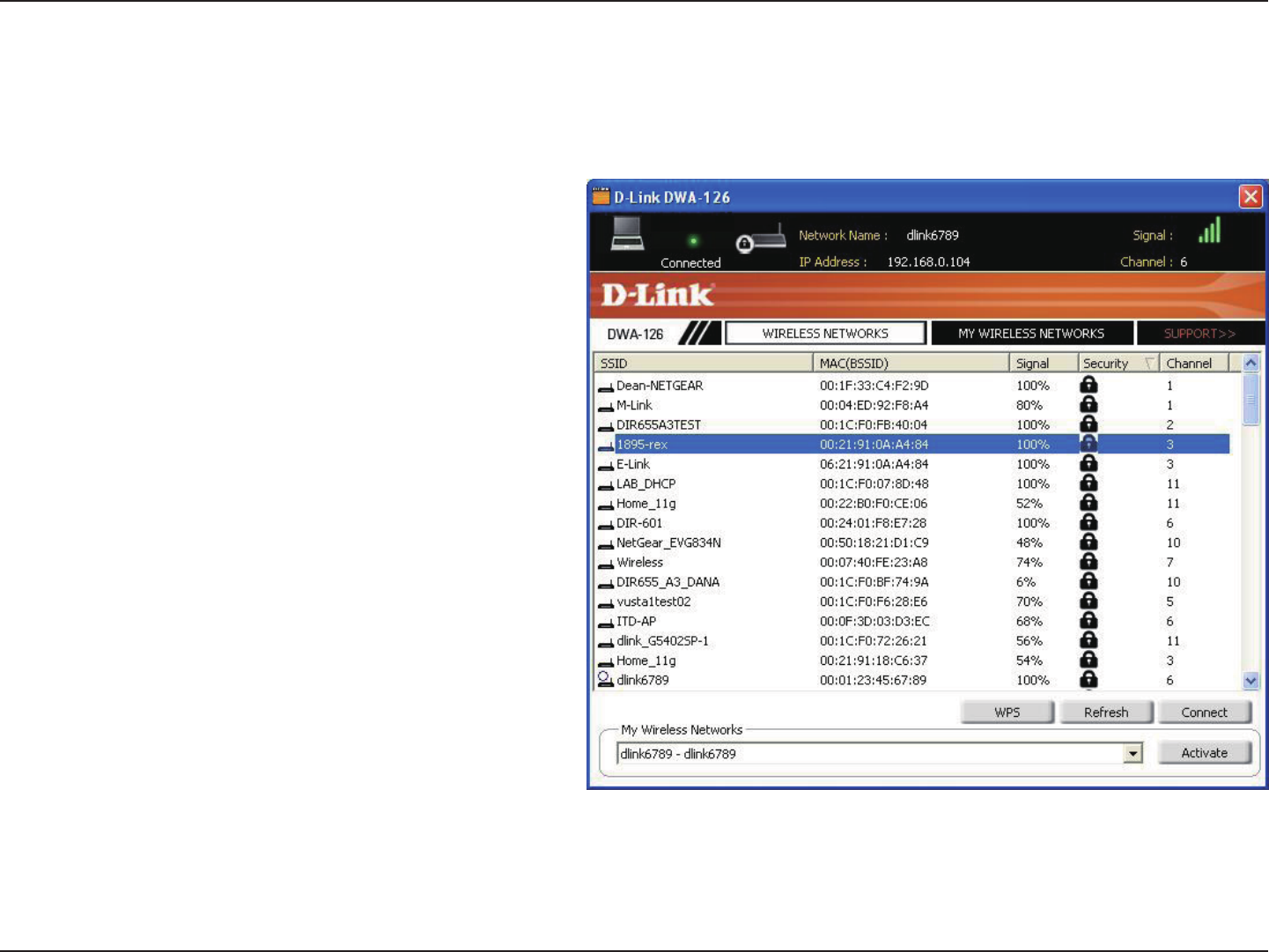 The D-Link DWA-126 uses the Wireless Connection Manager as the management software. The manager provides