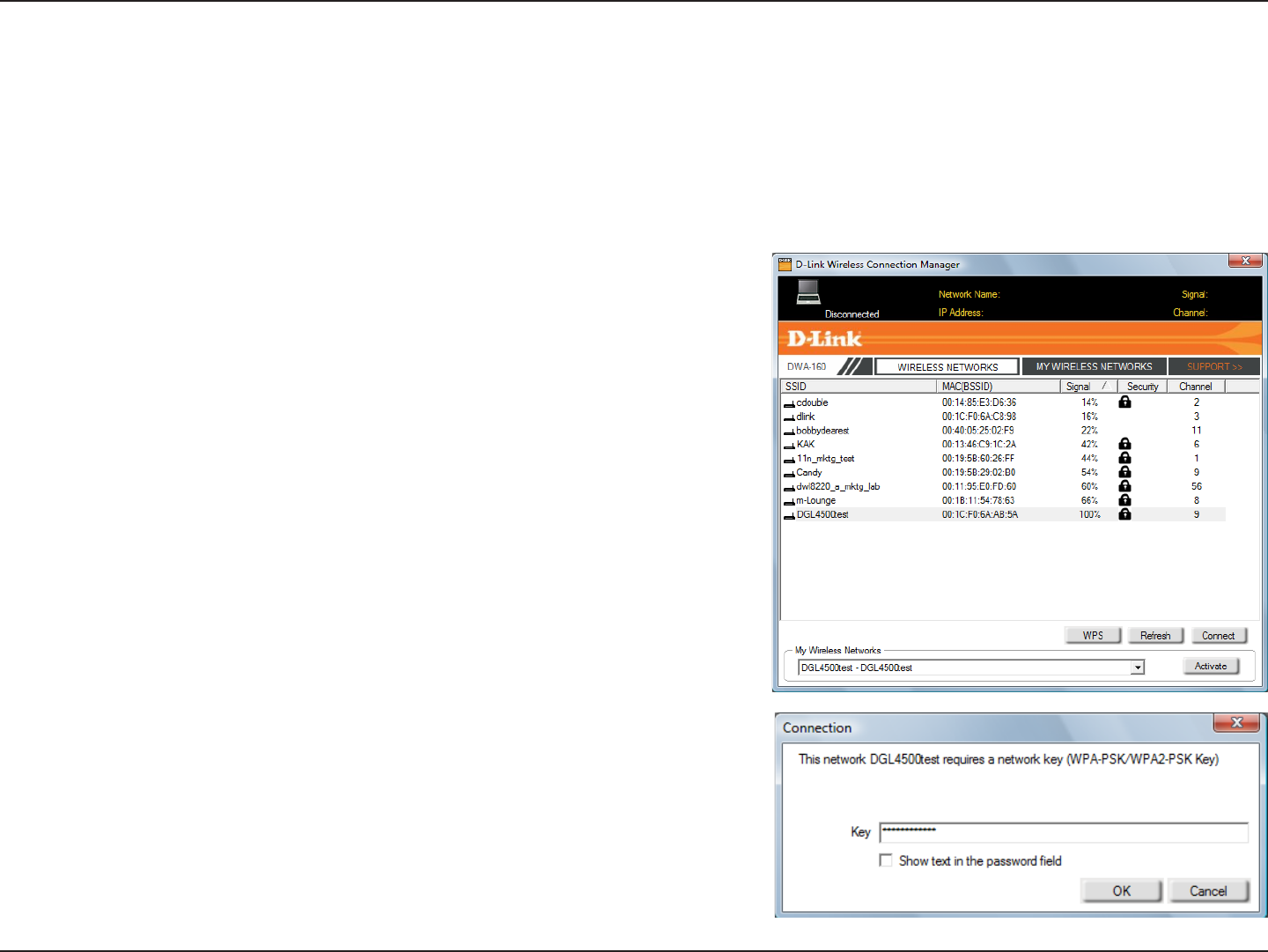 to a network, simply highlight the wireless network (SSID) and click Connect.