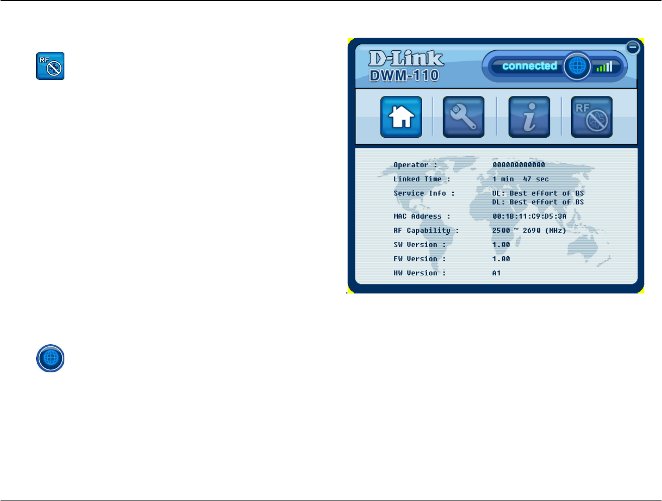 • Visual graphic icon and signal strength for connecting and disconnecting WiMAX