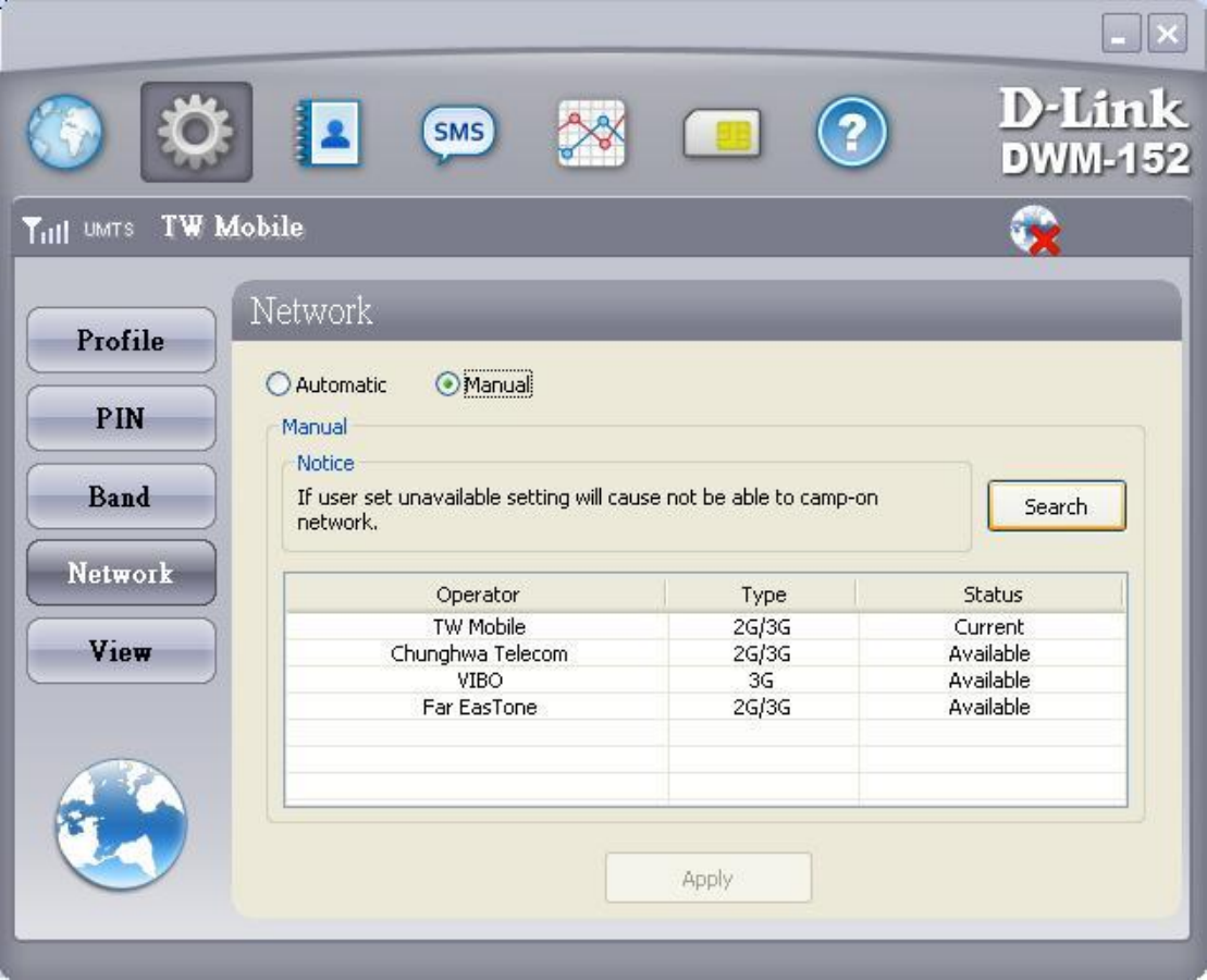 By default the Data Card will select the Taiwan Mobile network automatically.