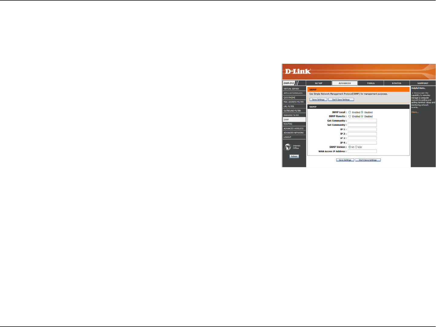 network device to the administrator of the network. SNMP can be used to monitor trafc and statistics of the DWR-512. The DWR-512
