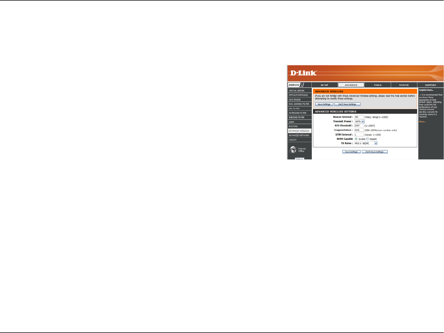 Advanced Wireless contains settings which can negatively affect the performance of your router if congured improperly. Do not change
