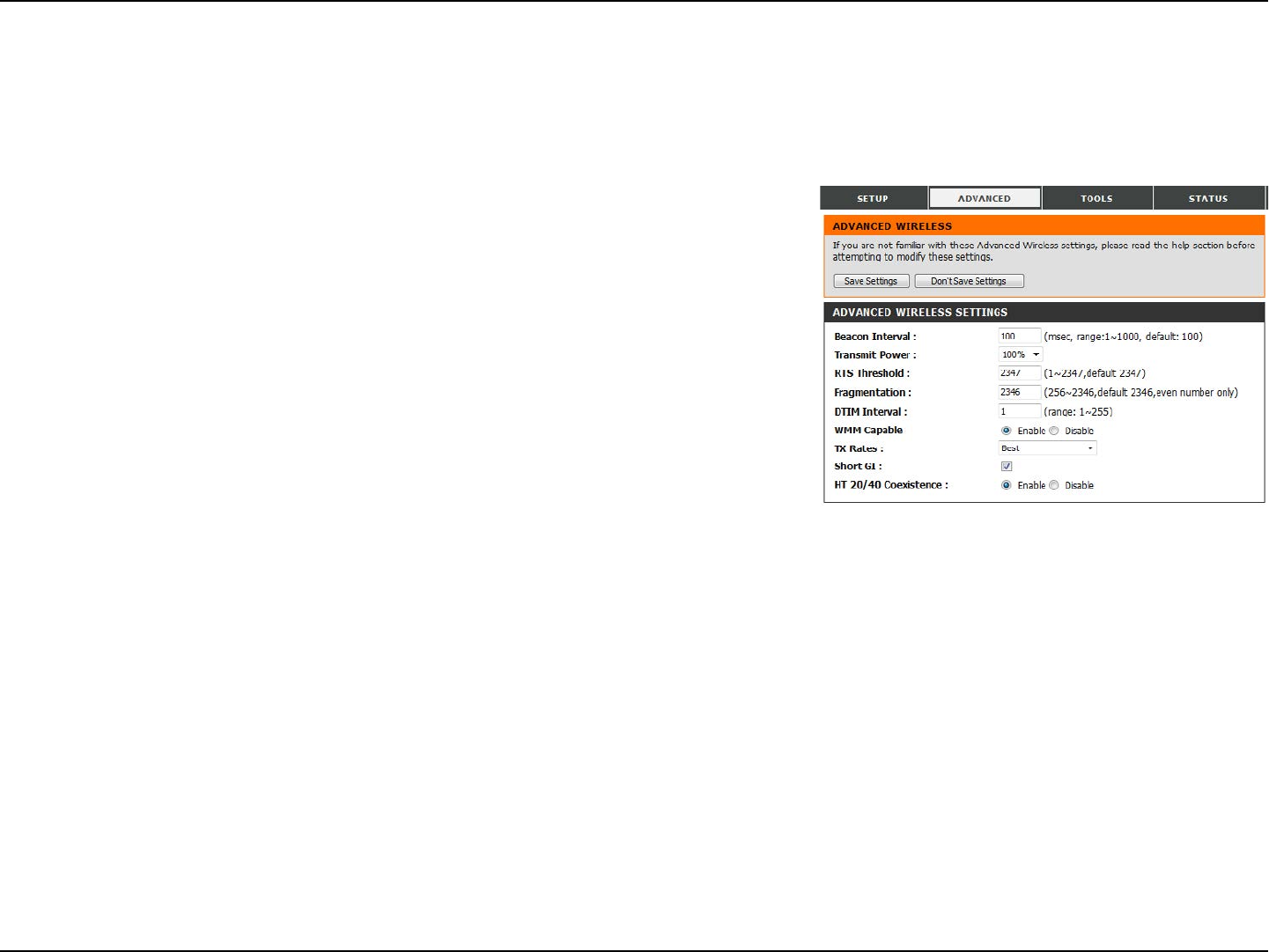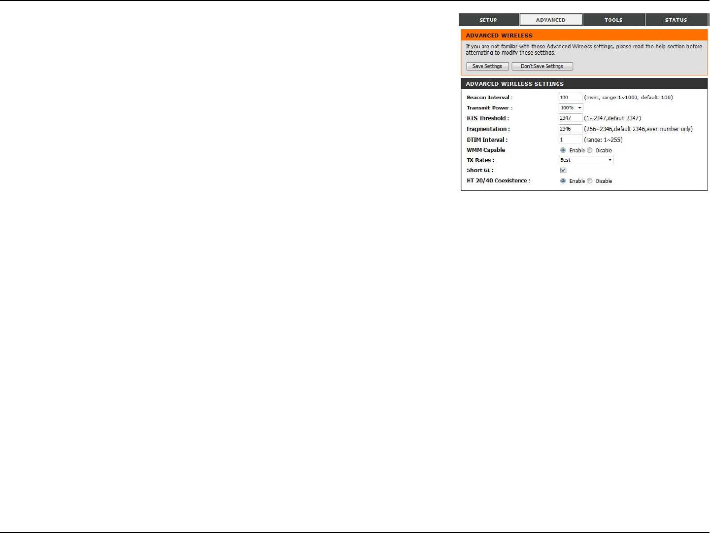 Advanced wireless contains settings which can negatively aect the performance of your router if congured improperly. Do not change these