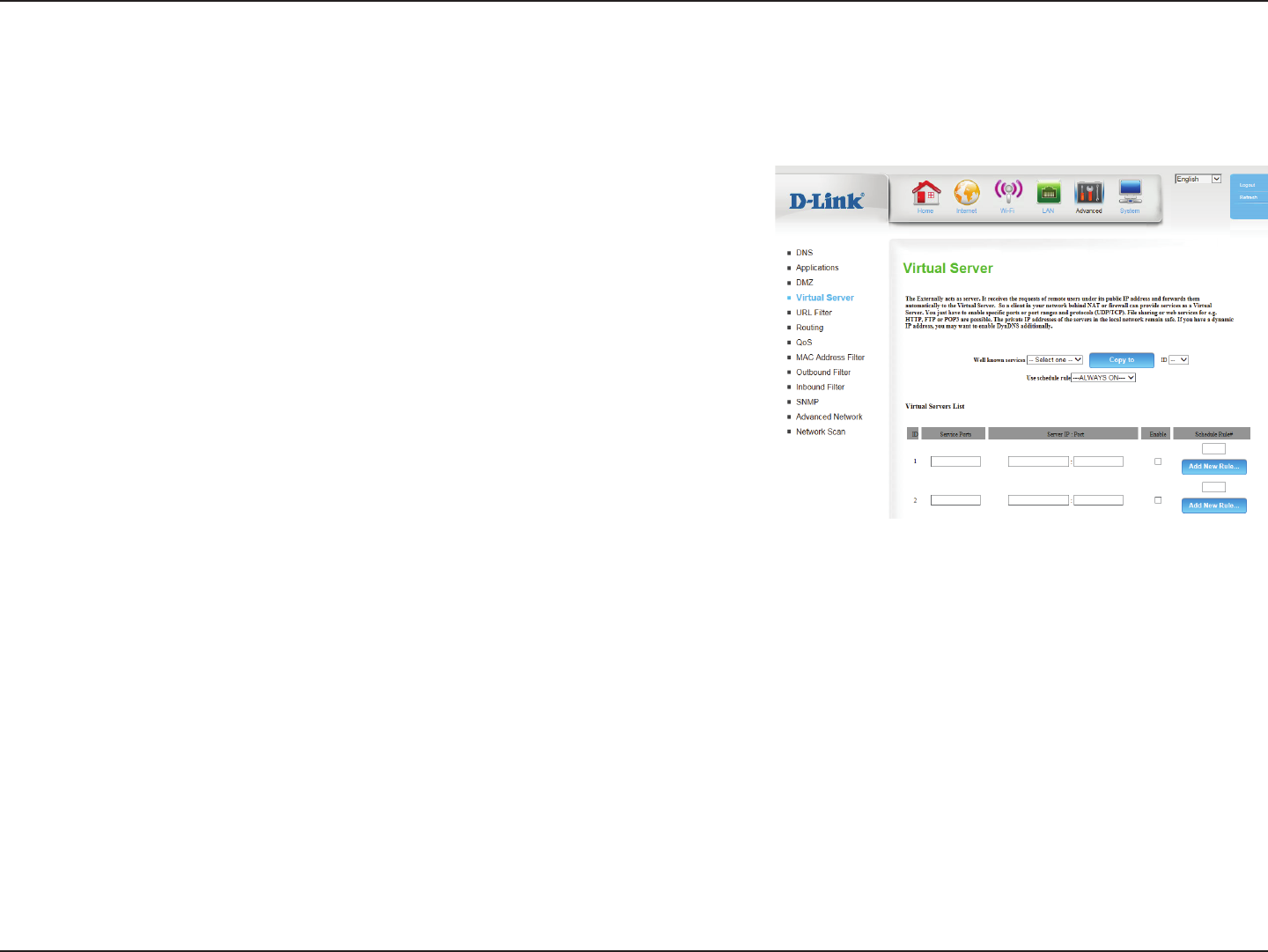 The device can be congured as a virtual server so that users can access services such as Web or FTP via the public (WAN) IP address of the router.