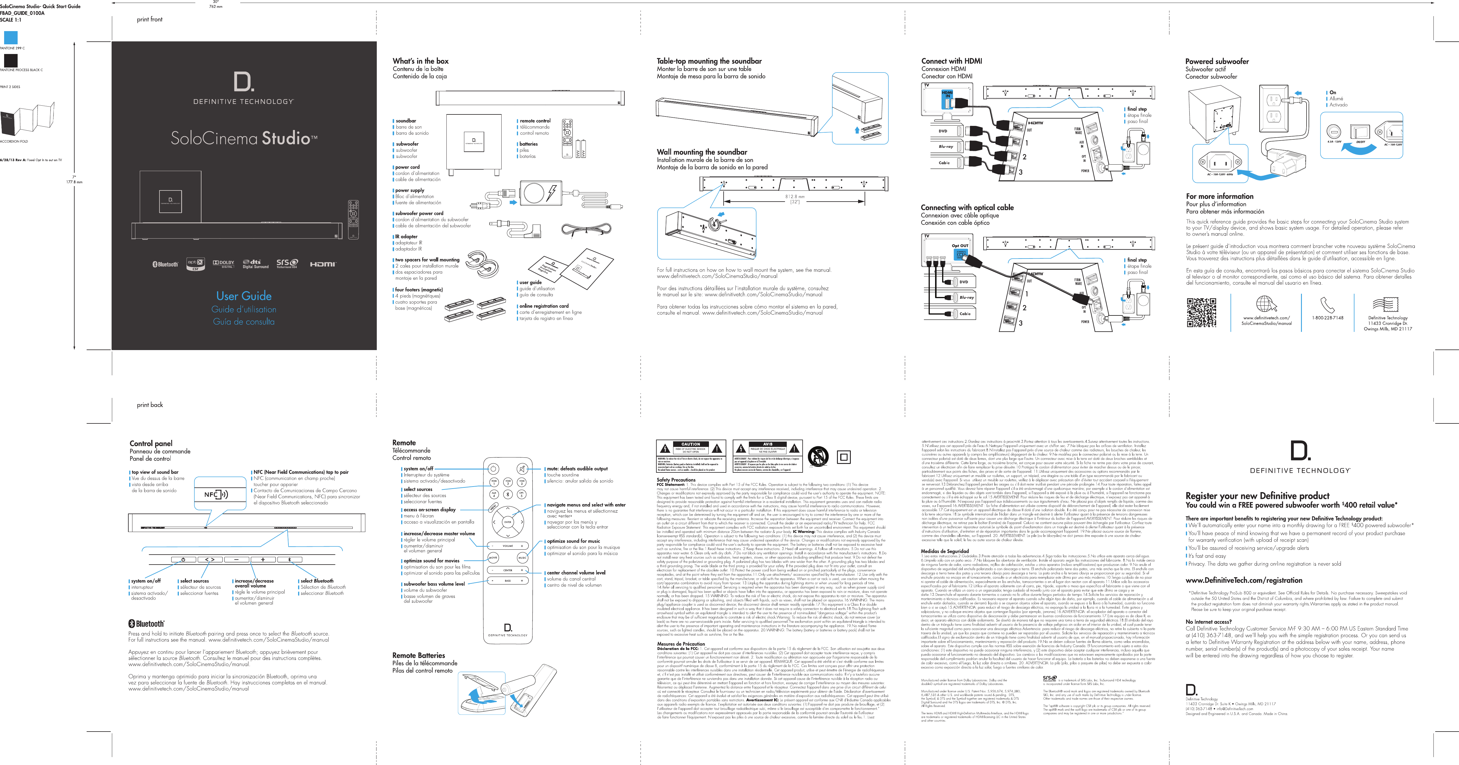 DEI Sales Definitive Technology SOLOCINSTUDIO Hometheater with wireless subwoofer User Manual FBAD GUIDE 0100B