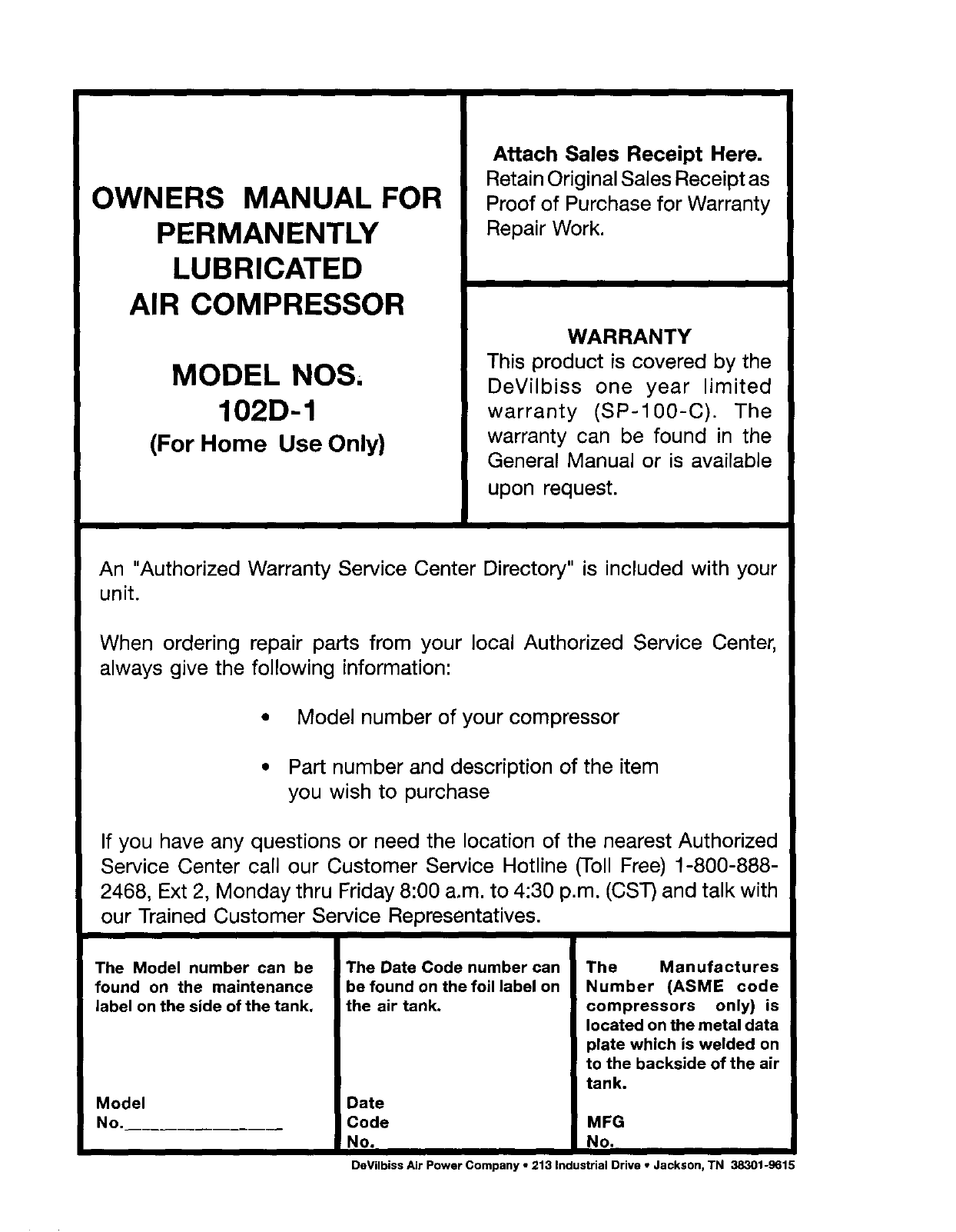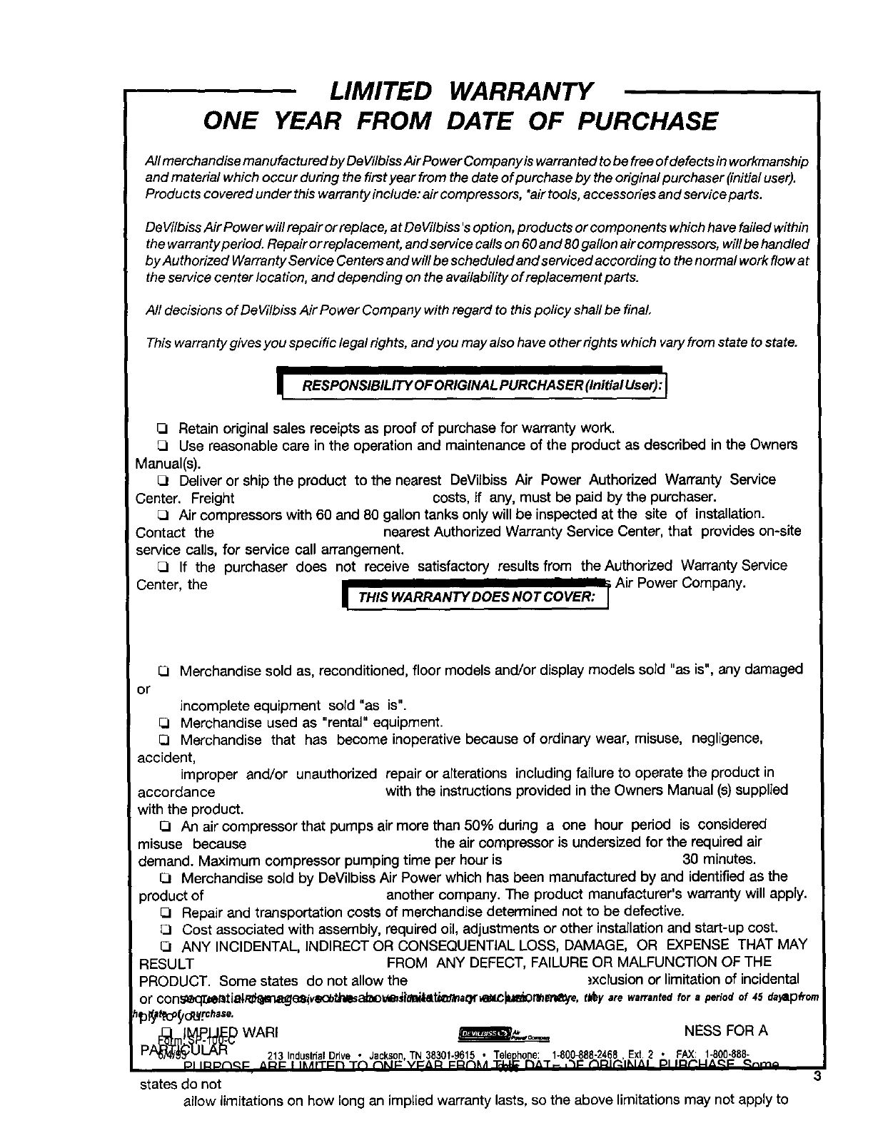 All merchandise manufactured by De VilbissAir Power Company is warranted to be free ofdefects in workmanship