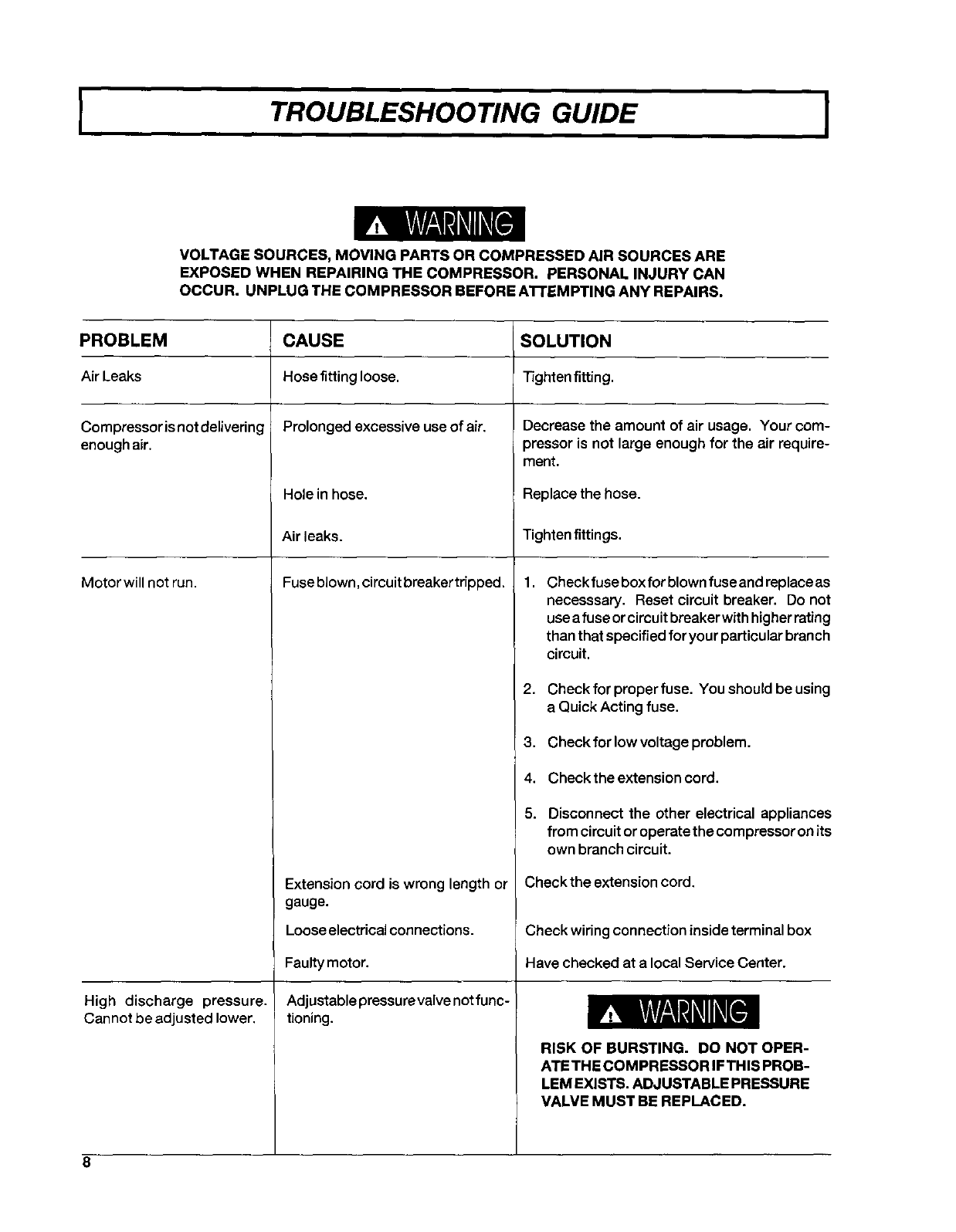 the warranty period. Repair or replacement, and service calls on 60 and 80gallon air compressors, will be handled