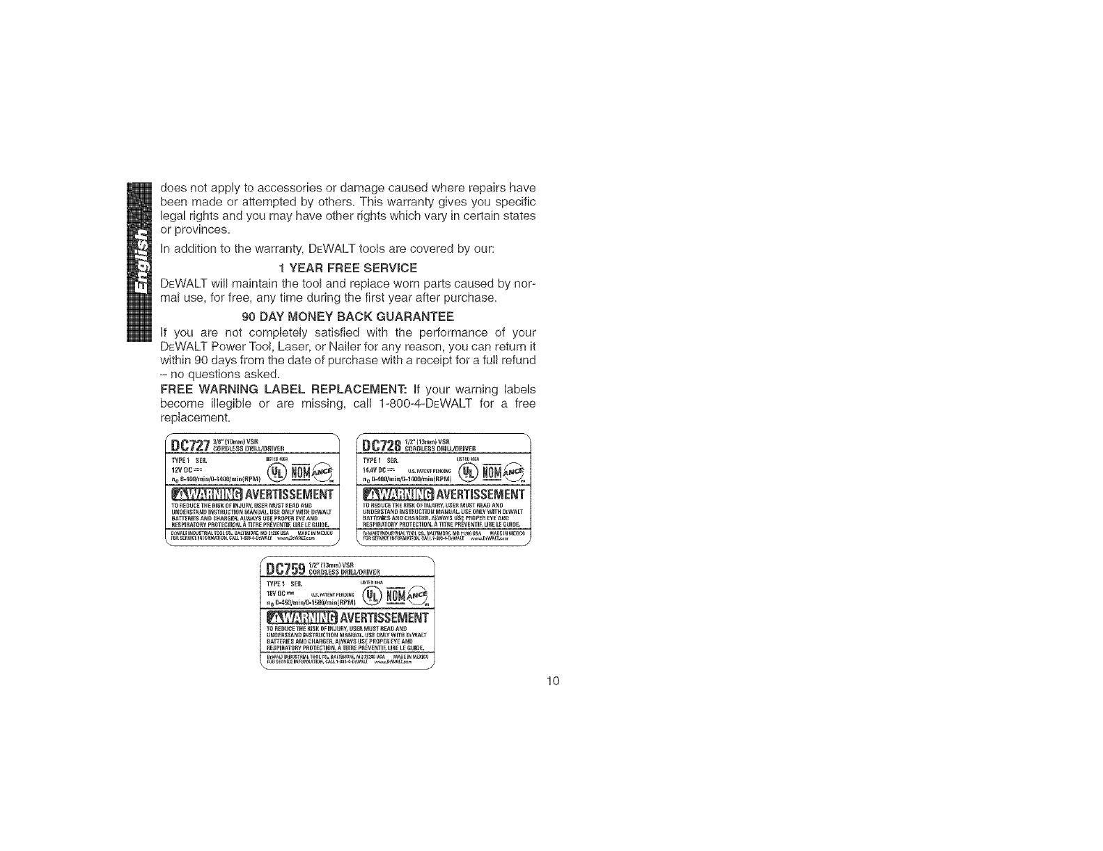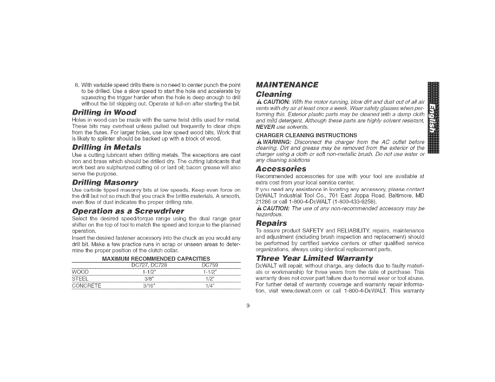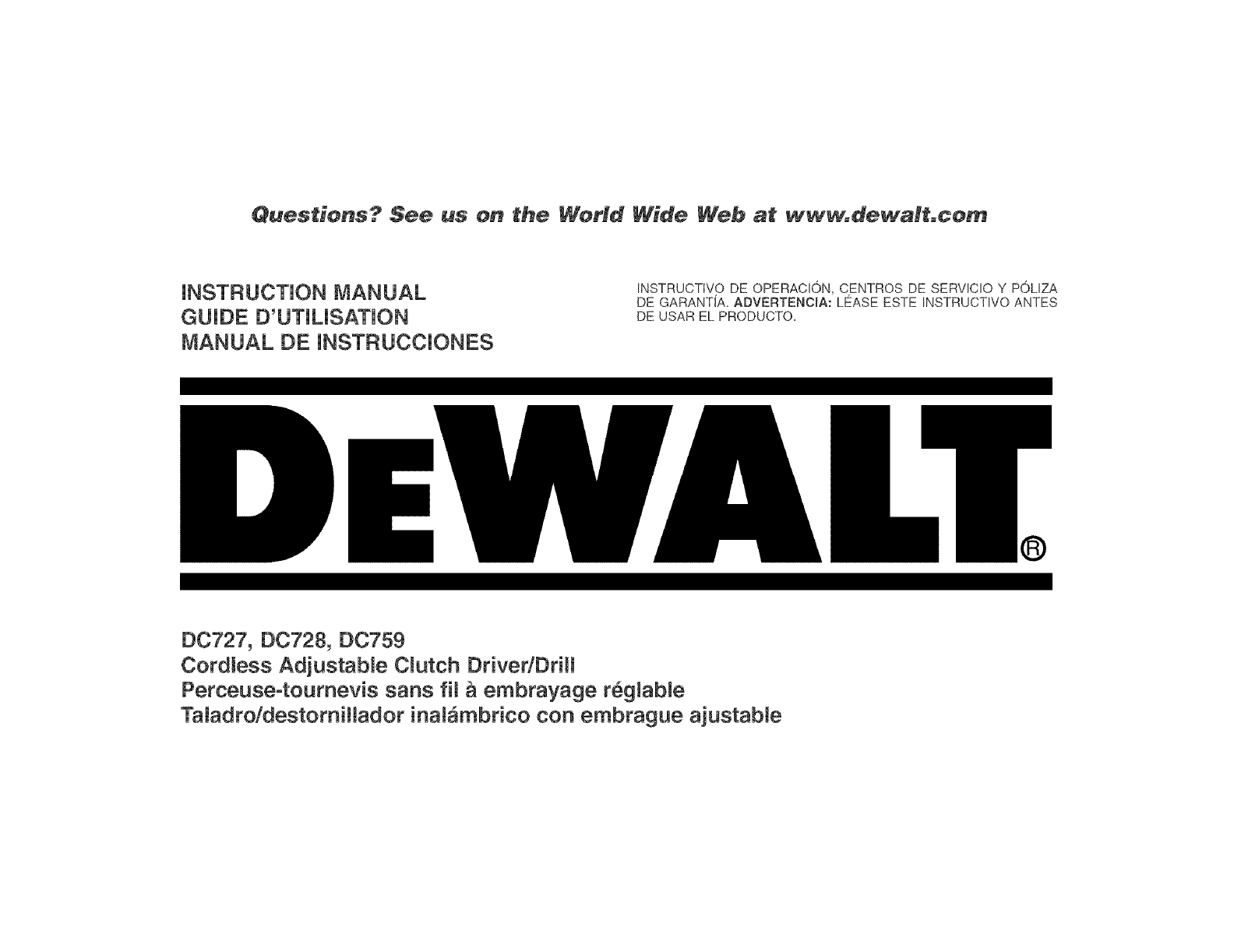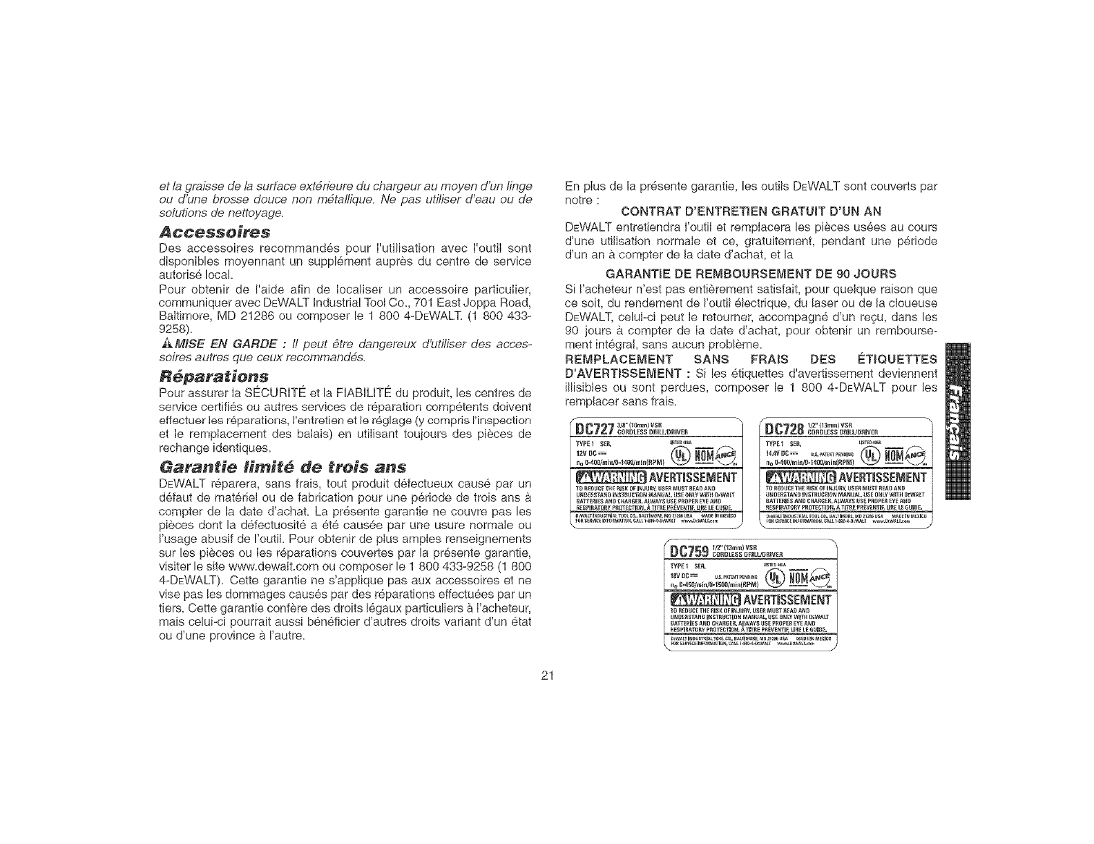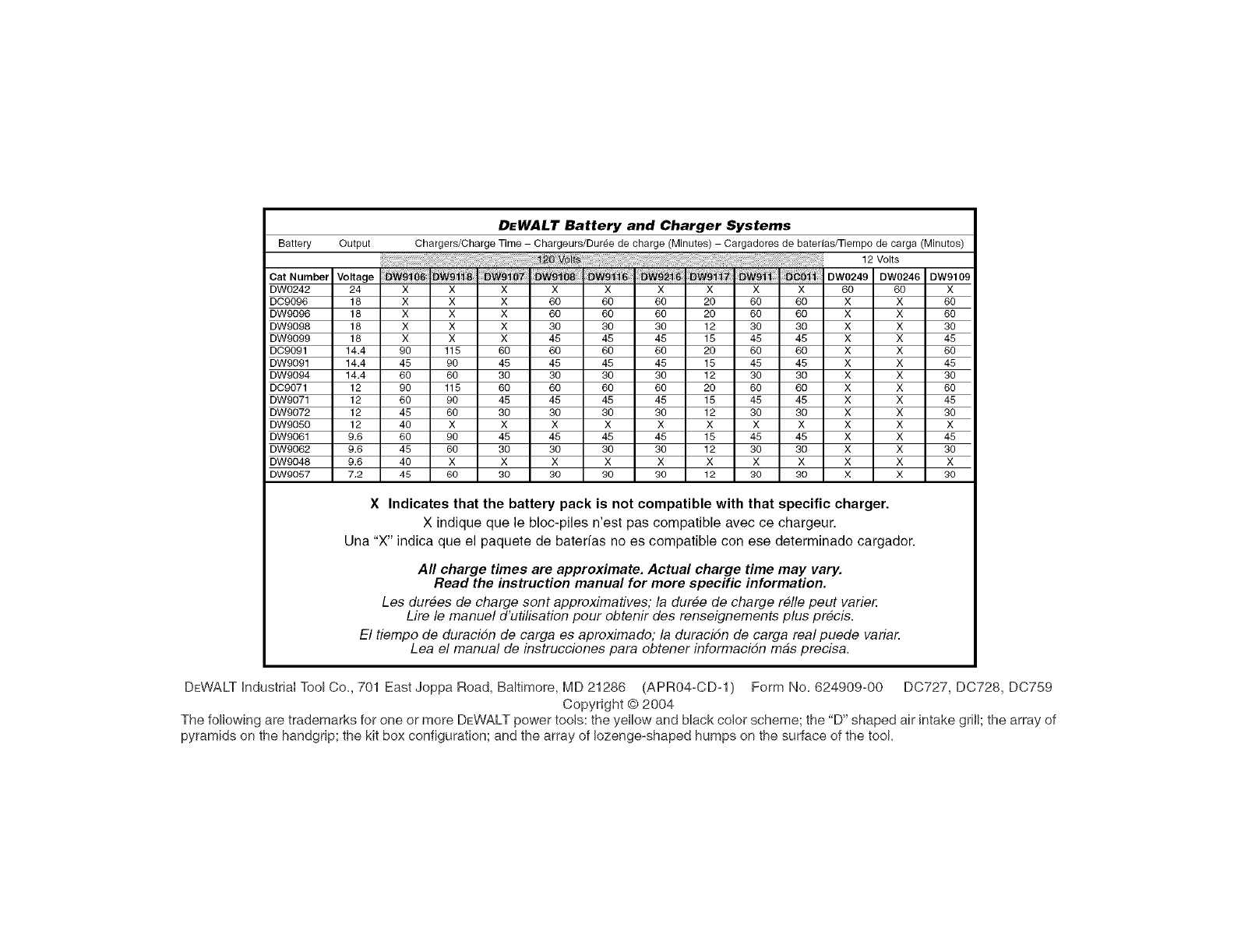 DEWALT Industrial Tool Co., 701 East Joppa Road, Baltimore, MD 21286 (APR04-CD-1) Form No. 624909-00 DC727, DC728, DC759