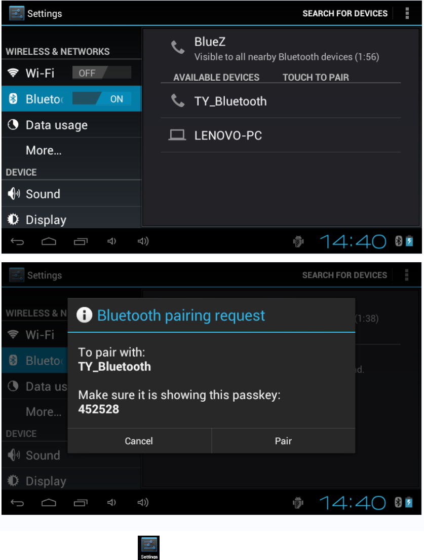 4.4.1 Settings-Bluetooth, turn on Bluetooth (Other device need to turn on Bluetooth which