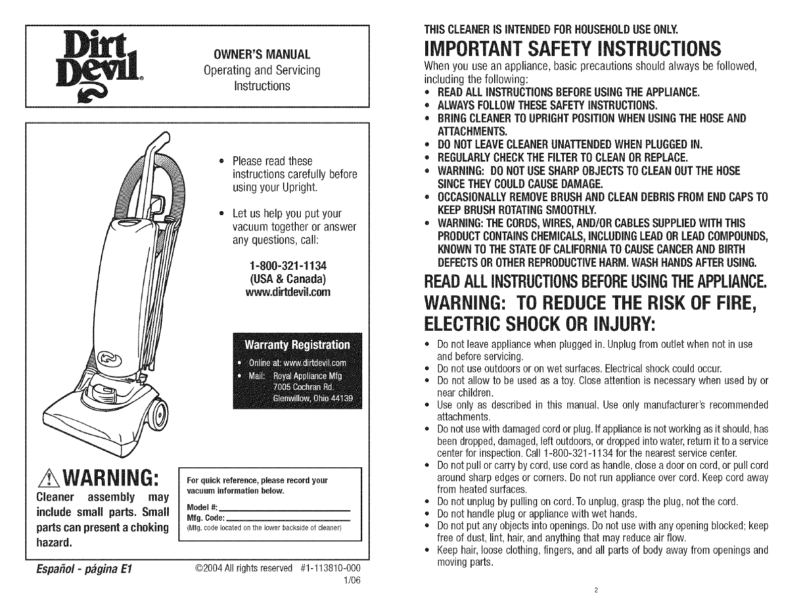 DIRT DEVIL Vacuum, Upright Manual L0606617