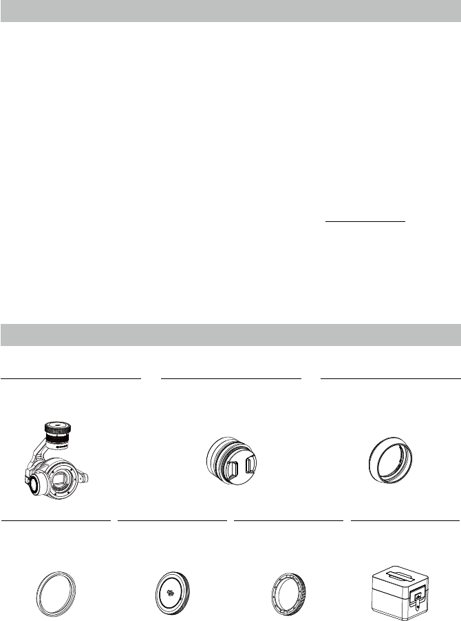 * 如果购买 Zenmuse X5S 镜头套装,则包含镜头(带前保护盖)、遮光罩、云台相机镜头卡口保护盖,镜头后保护