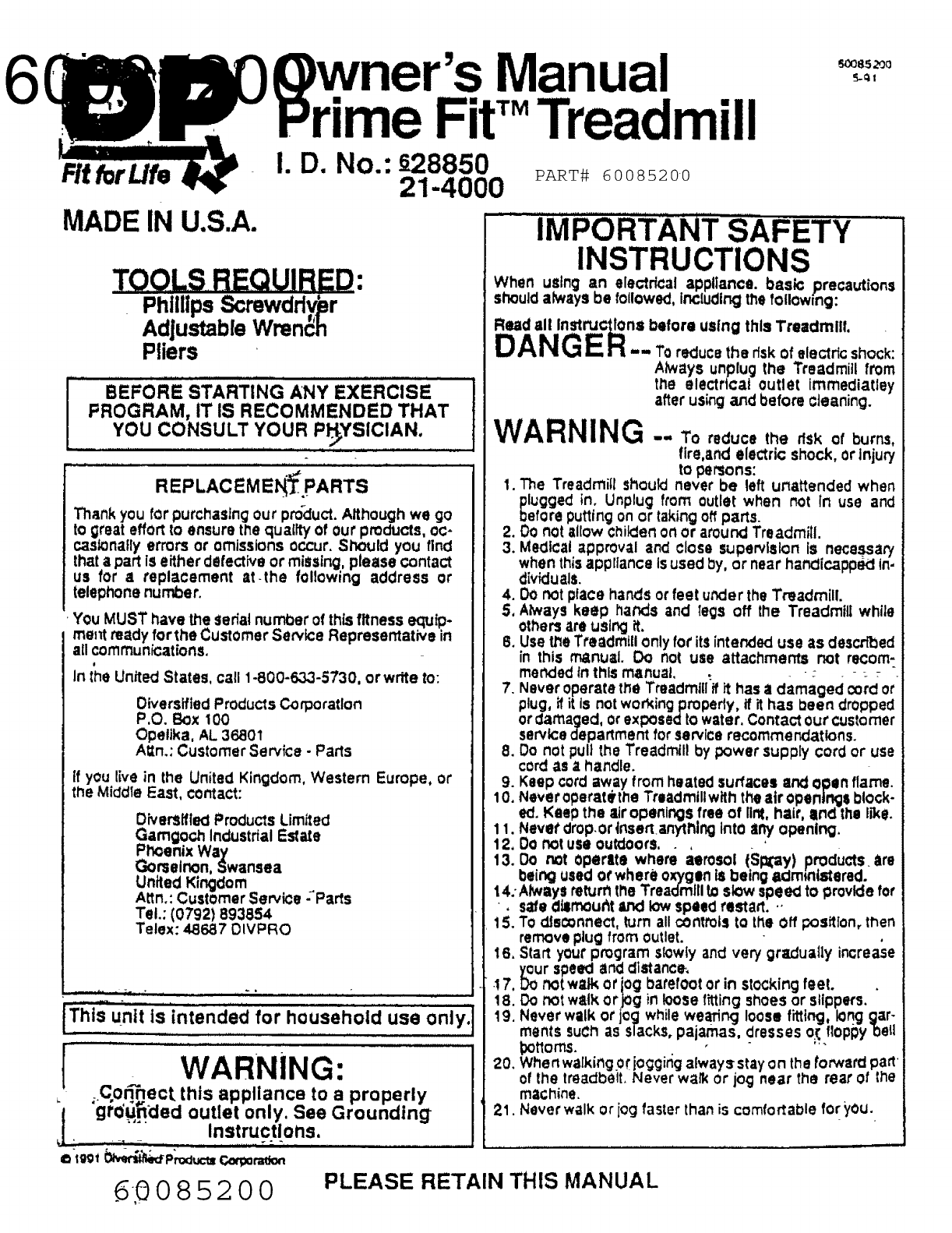 User Manual: DP 21-4000 21-4000 DP PRIME FIT TREADMILL - Manuals and Guides View the owners manual for your DP PRIME FIT TREADMILL #214000.