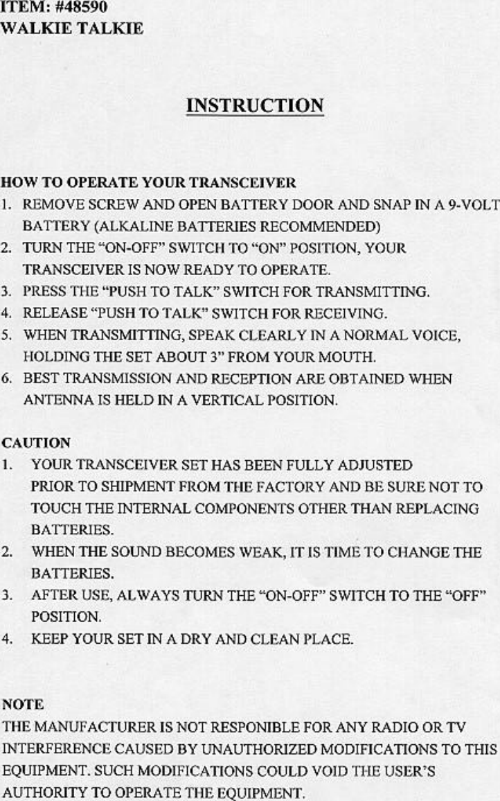 DSI 48590 49 MHz Walkie Talkie - Transmitter User Manual users manual