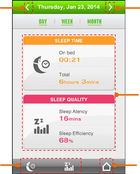 • Sleep Time: display the analyzed data of the selected date, including On bed time,