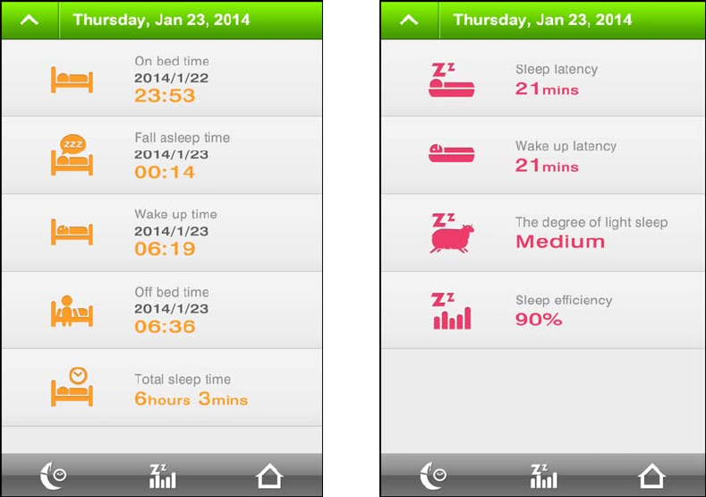• Sleep analysis: On bed time, Off bed time, fall asleep time,