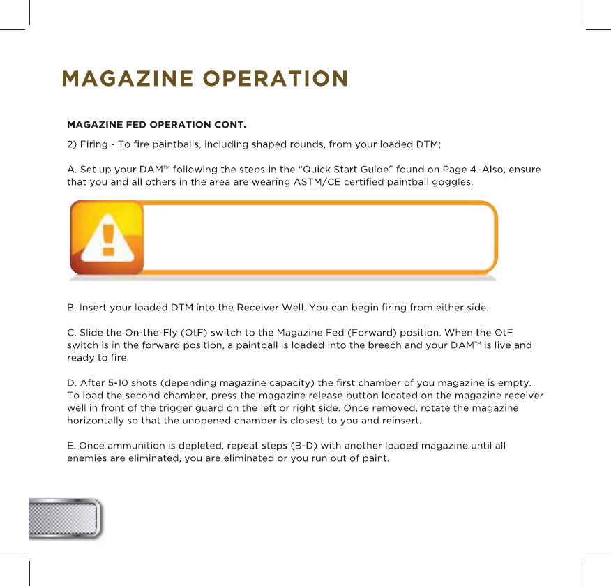 WARNING: Loaded magazines will eject paintballs as soon as the