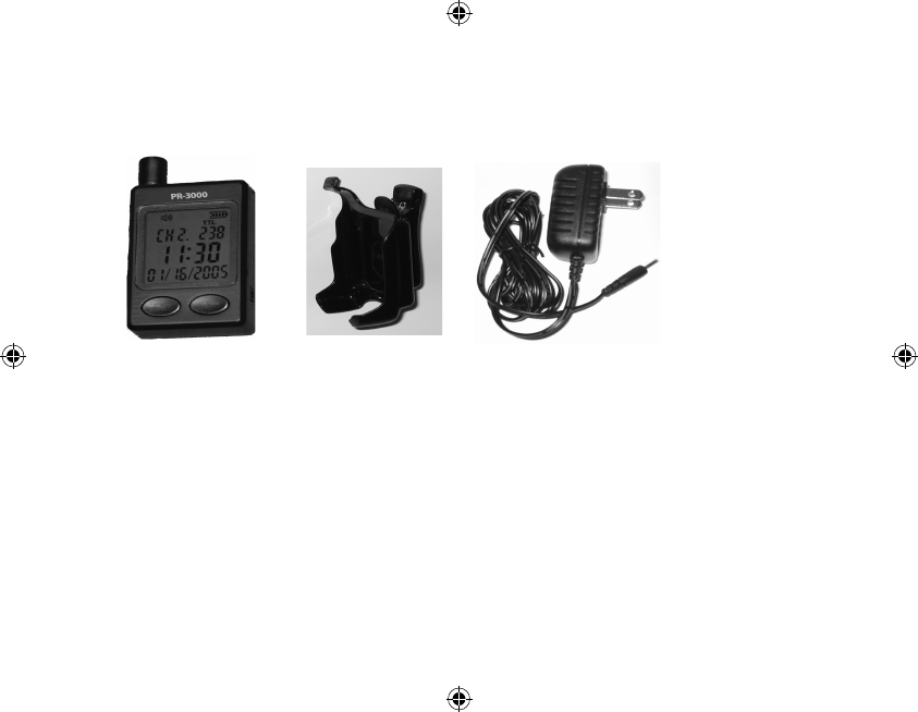 The PR-3000, battery charger, and belt clip. (figure 1)