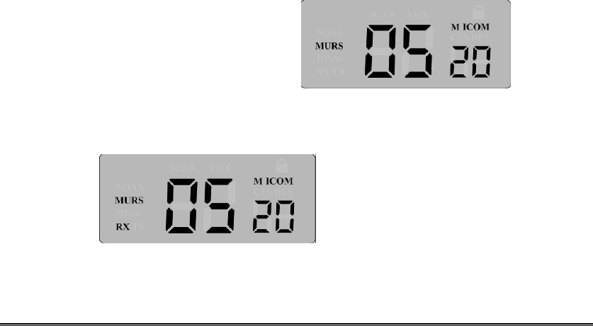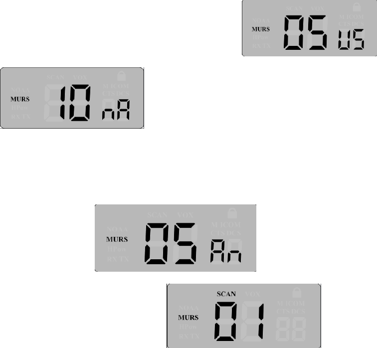 3. Press UP or DOWN to select a channel, US stands for MURS channel 1 to 5; Press ON/OFF