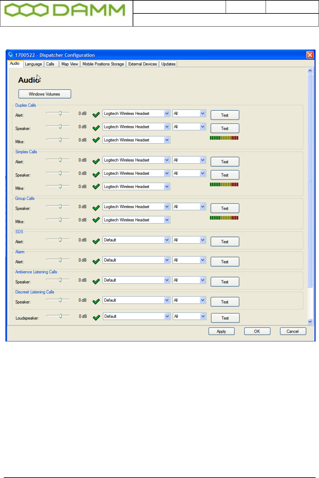 The audio device is configured from the Audio tab in the Dispatcher Configuration dialog.