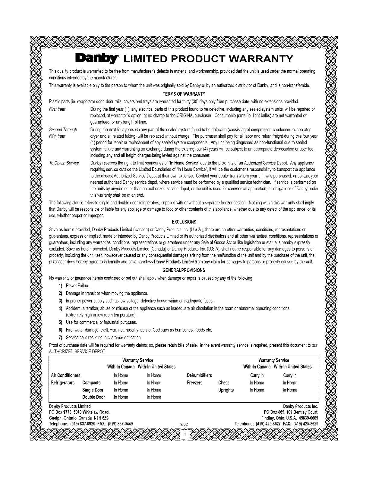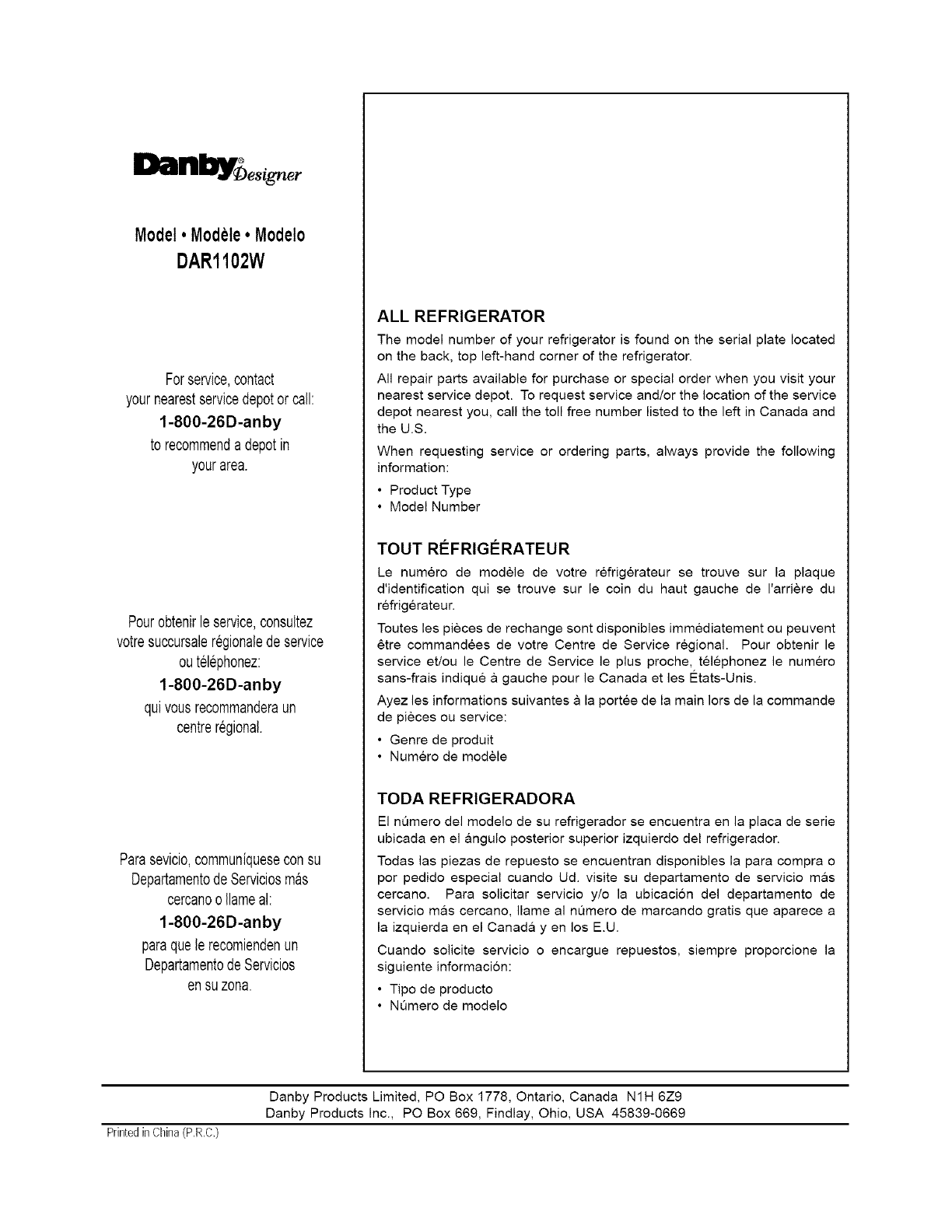 Danby Products Limited, PO Box 1778, Ontario, Canada N1H 6Z9