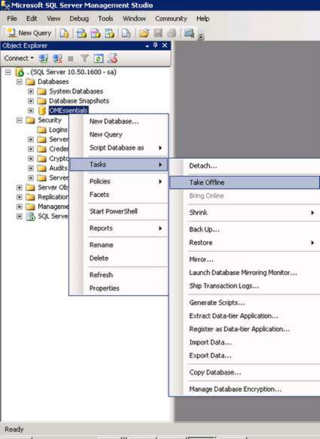 database offline, right-click the database and select “Take Offline” under “Tasks” as