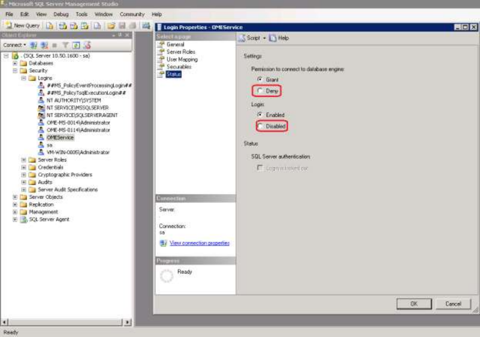 ii. Navigate to Security Logins and right-click the login used for installing OpenManage