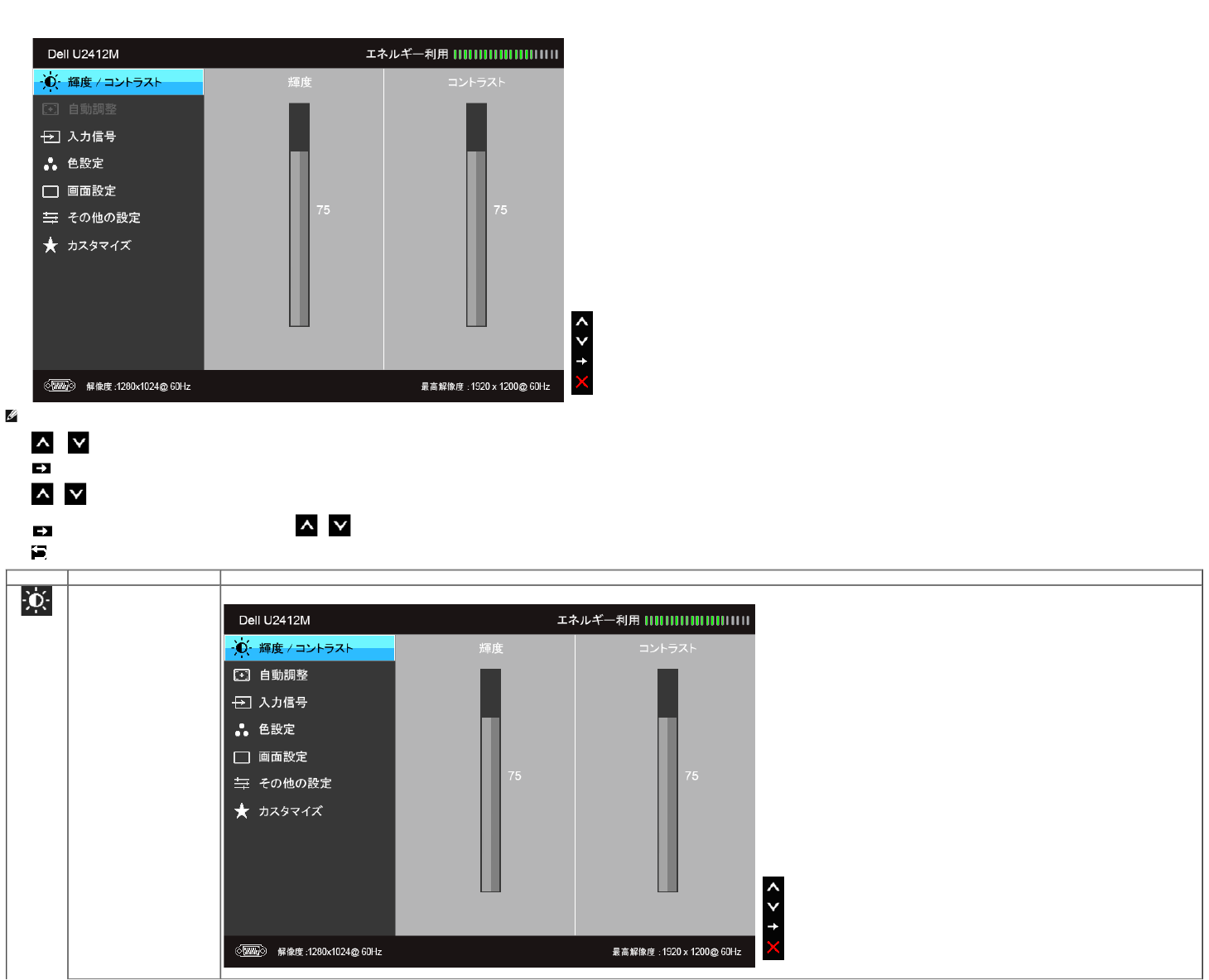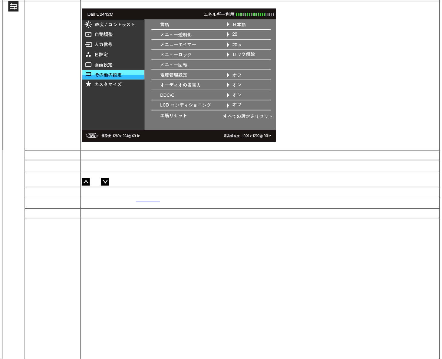 U2412M フラットパネルディスプレイにはアクティブマトリックス、薄膜トランジスタ(TFT)、液晶ディスプレイ(LCD)が搭載されています。モニターの機能は、以下のようになっています。
