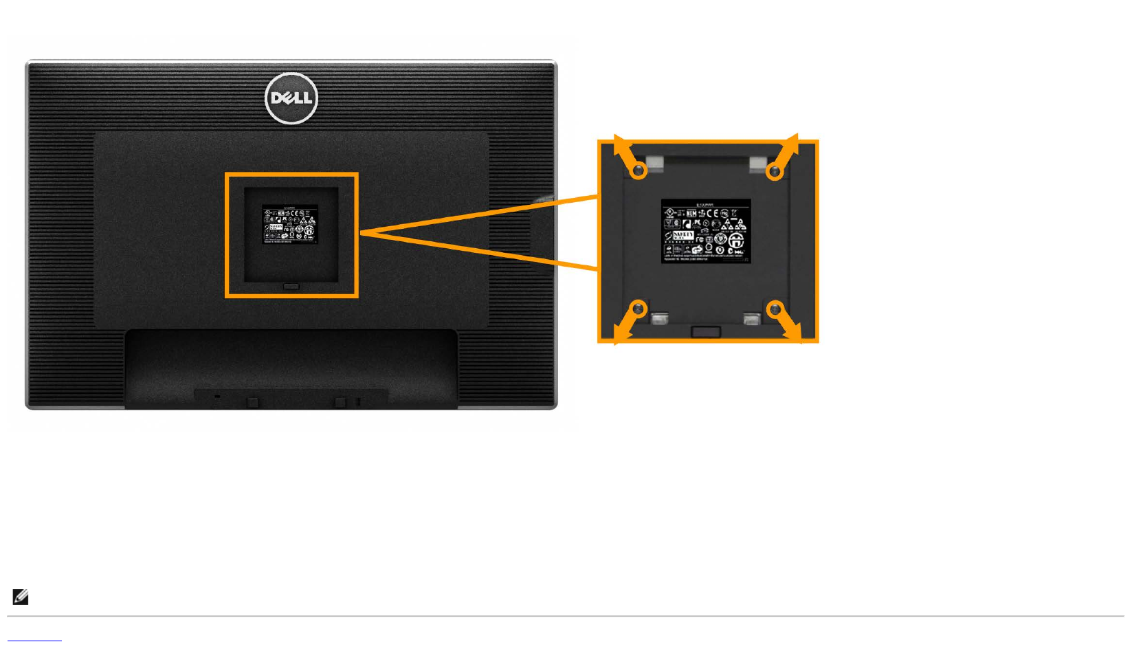 1VESA 安裝孔(100 mm x 100 mm - 於安裝的底盤後方) 採用 VESA 相容的壁掛安裝套件安裝顯示器(100 mm x 100 mm)。