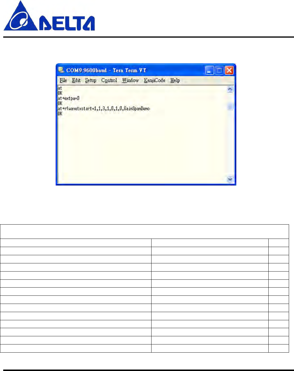 at+rfwavetxstart=1,9,3,1,0,1,0,GainSpanDemo Continuous Tx Channel 9, 11Mbps