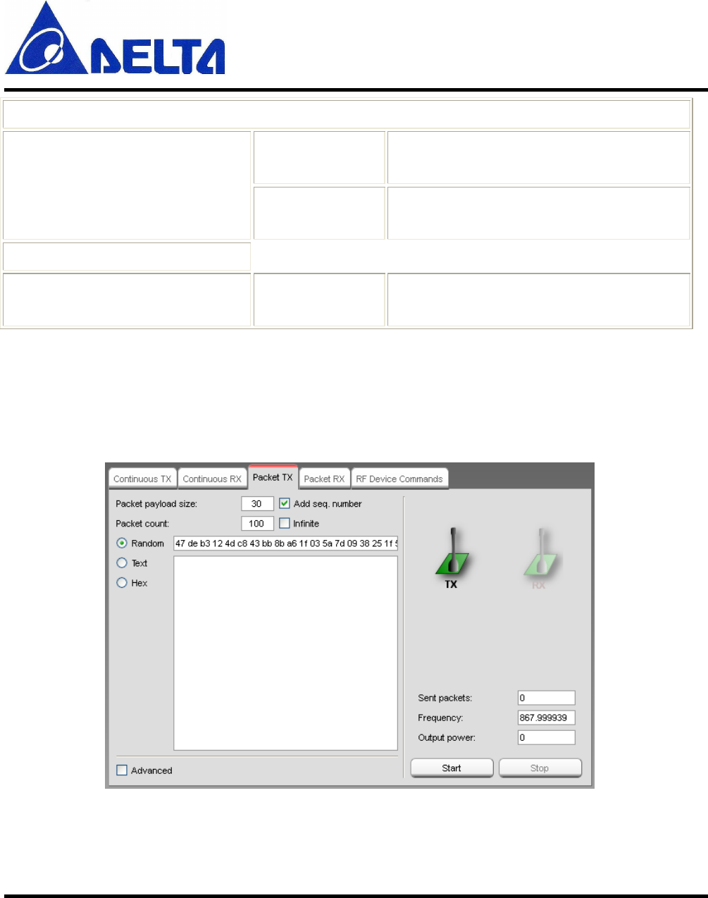 user can select between two test modes; Packet TX and Packet RX in the bottom panel.