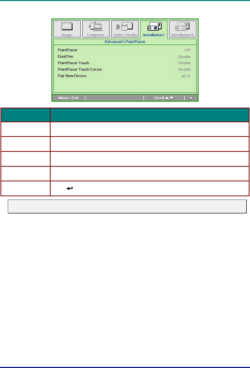 You can control the screen functions by pushing the PointRacer tip to the screen. Alternatively, you