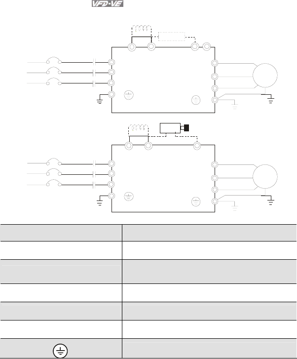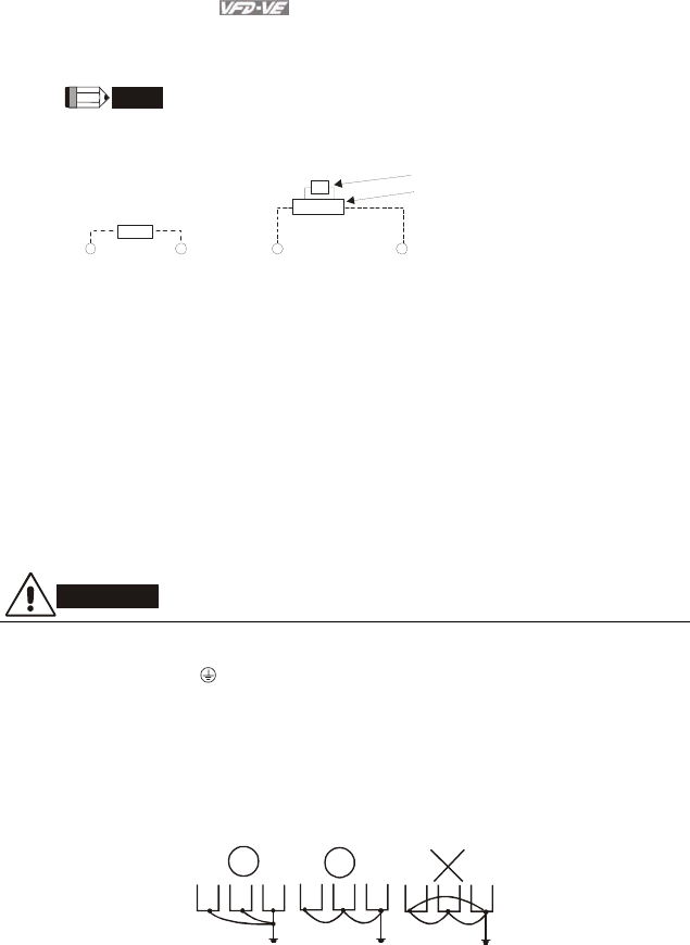 5. Ground the VFD-VE using the ground terminal. The grounding method must comply with the