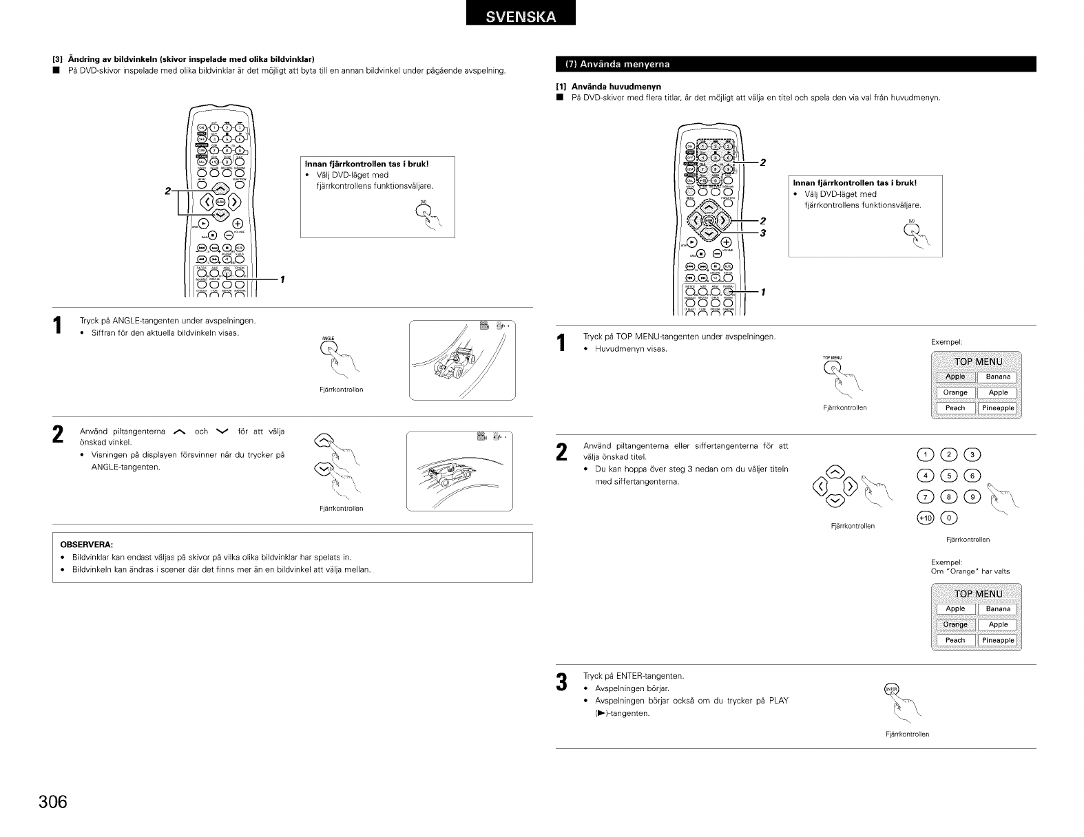 o • Bildvinkeln kan endast _ndras med DVD=skivor som har spelats in reed flera 306